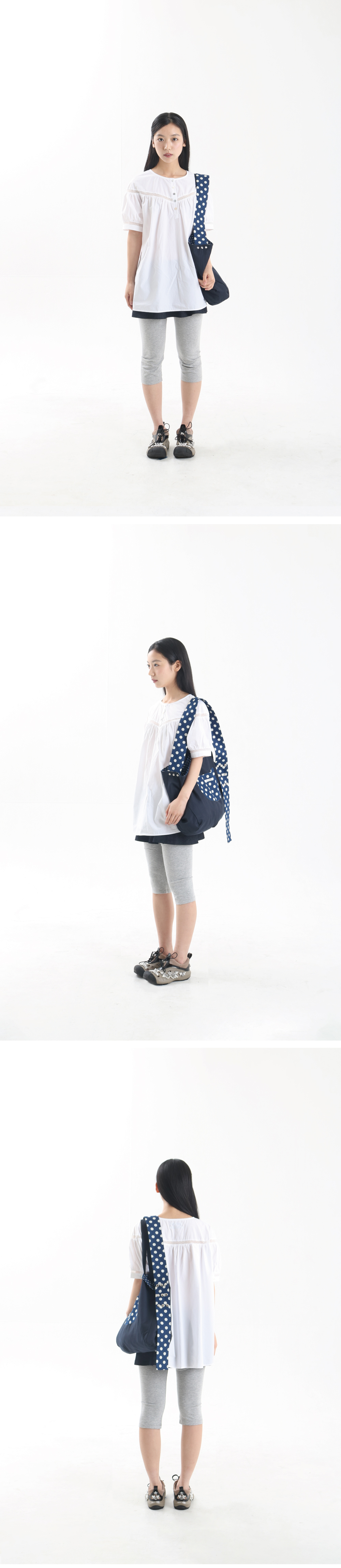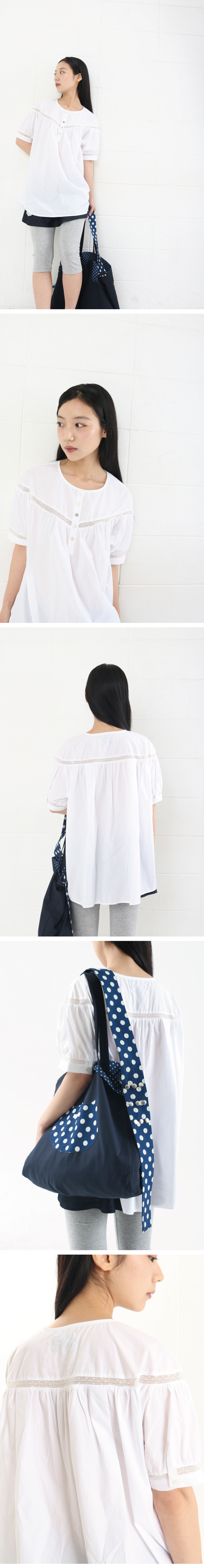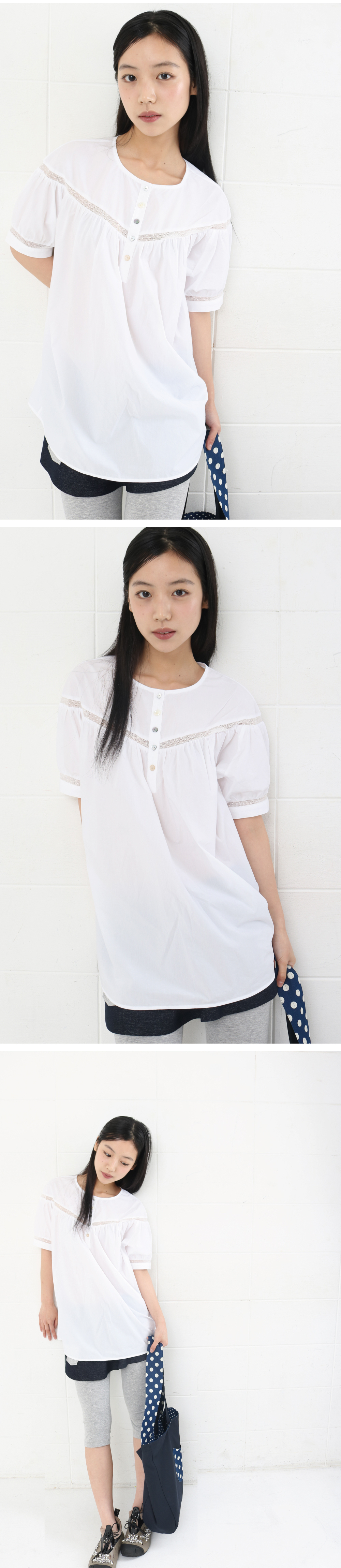 • 단추 디테일 포인트 • 셔링과 턱 포인트 • 레이스 배색 디자인 • 모델 착용 사이즈 FREE