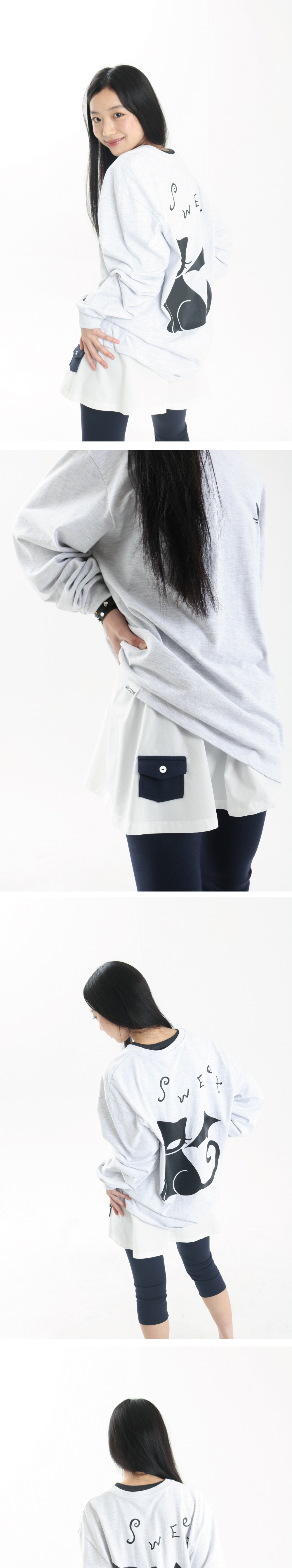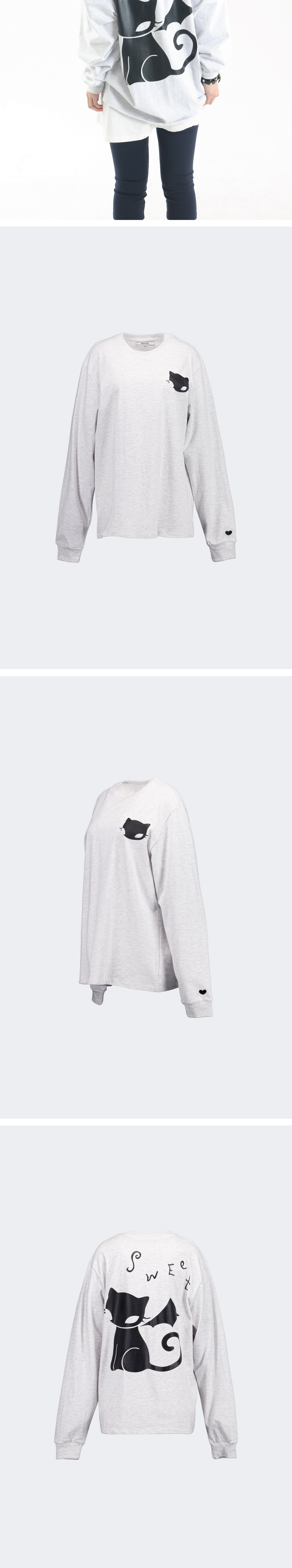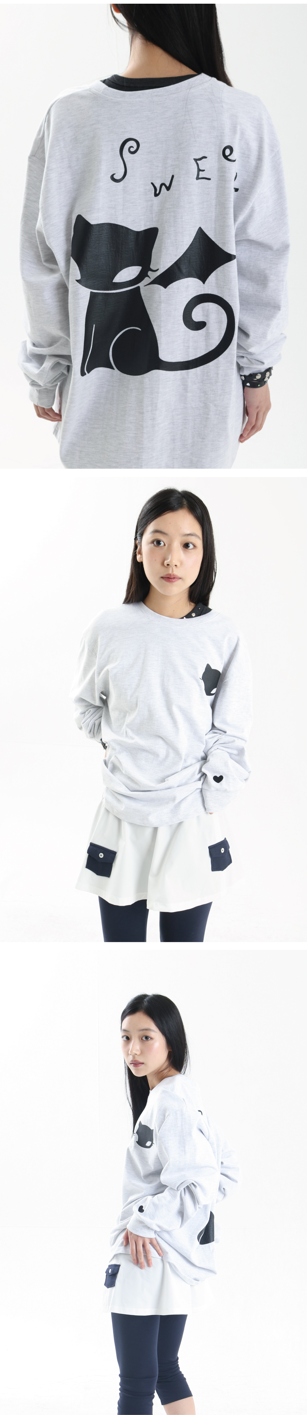 • 소매 하트 자수 디테일 • 체리 고양이 그래픽 • 아이보리 나염 프린트 • 부드러운 코튼 소재 • 여유로운 실루엣 • 모델 착용 사이즈 1