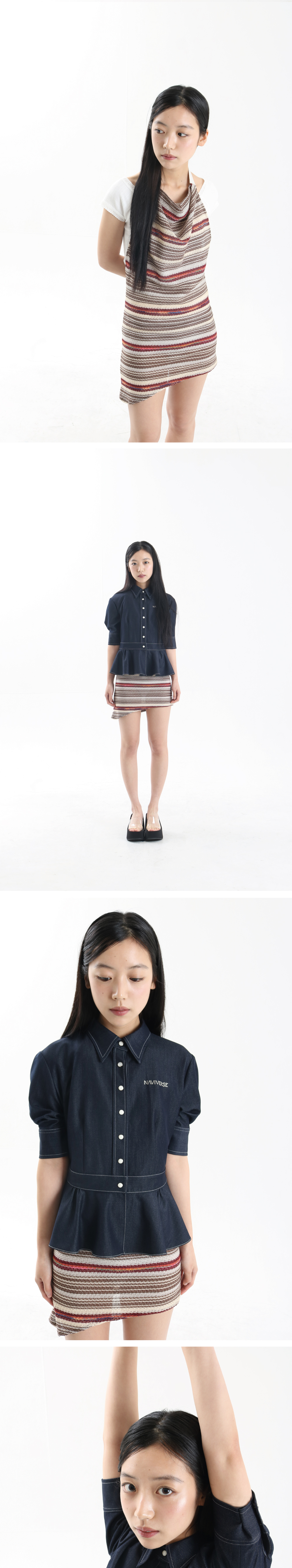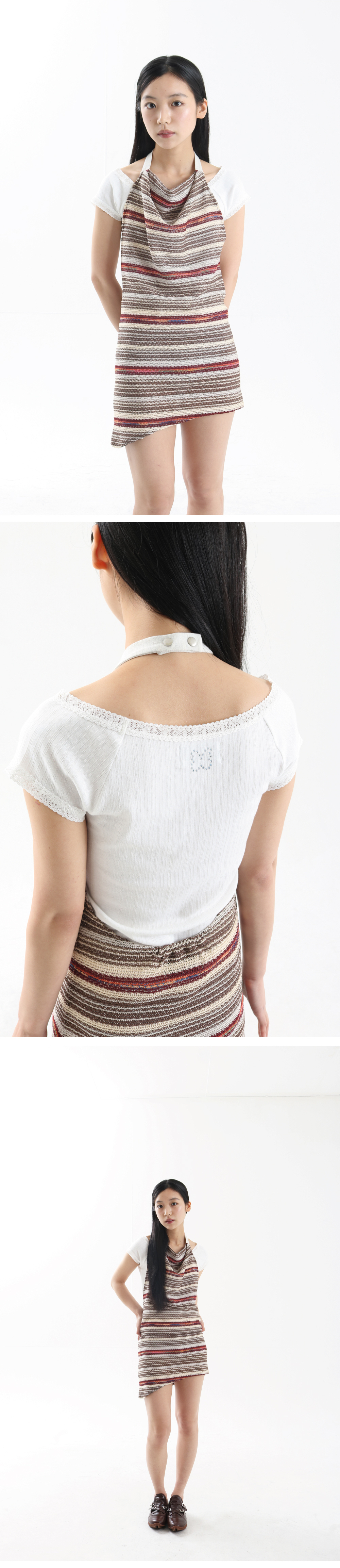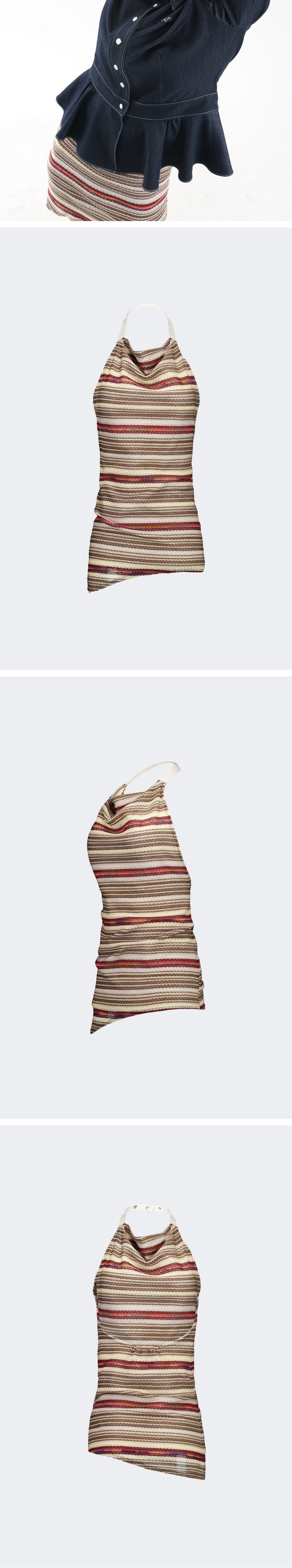 • 여름용 니트 원단 • 홀터넥 디자인 • 네크 부분 배색 디테일 • 나비버스 로고 각인 스냅 사용