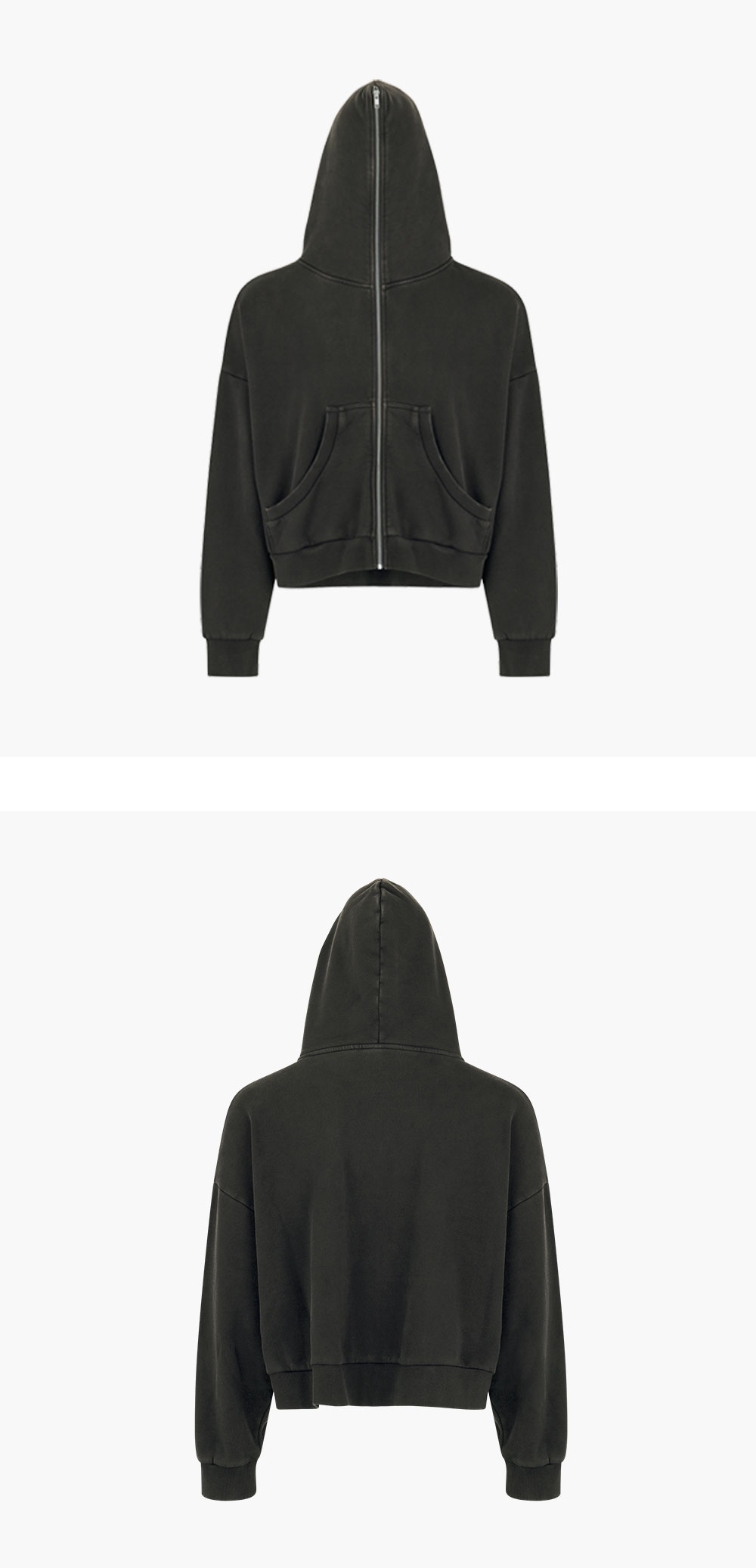 엔타이어 스튜디오의 이터널 집업 워시드 블랙 컬러입니다. -510gsm -후드 끝까지 올라오는 YKK 메탈 프론트 지퍼 -유니섹스 사이즈