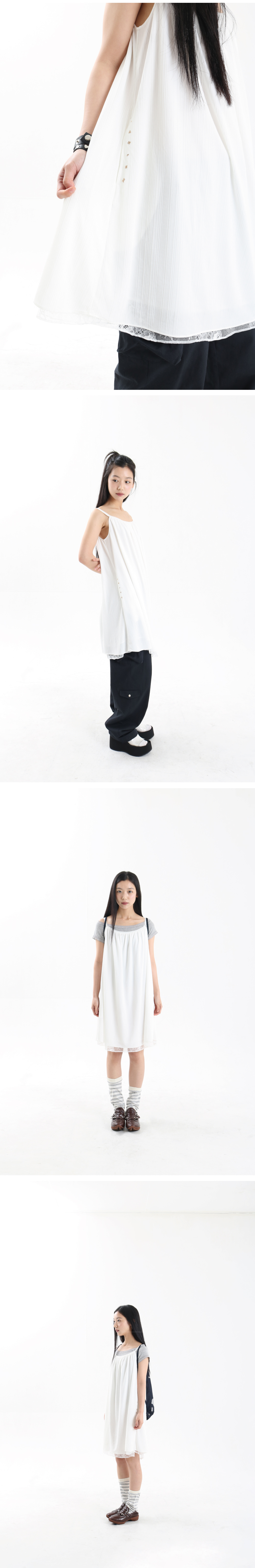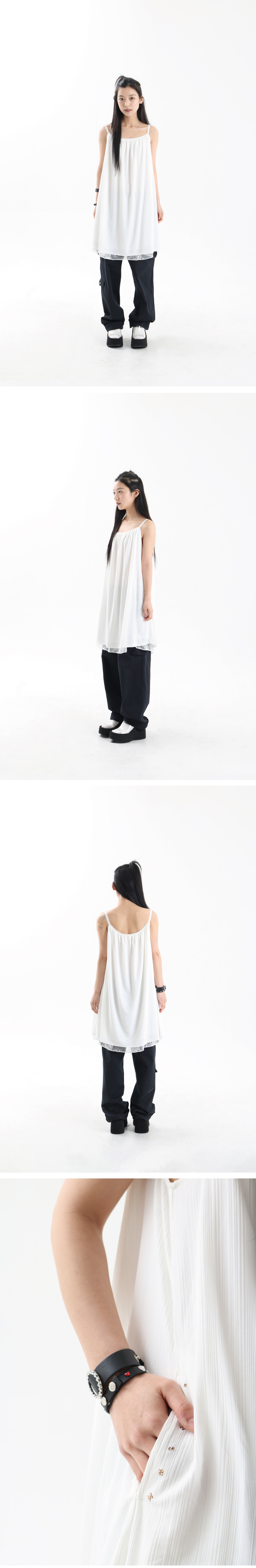 • 은은한 광택의 원단 • 가슴 부분 전체 셔링 디테일 • 양 옆 주머니 스와로브스키 정품 디테일 • 은은한 광택의 원단 • 가슴 부분 전체 셔링 디테일 • 양 옆 주머니 스와로브스키 정품 디테일 • 레이스 밴딩 끈 디테일 • 밑단 레이스 배색 • 레이스 밴딩 끈 디테일 • 모델 착용 사이즈 FREE