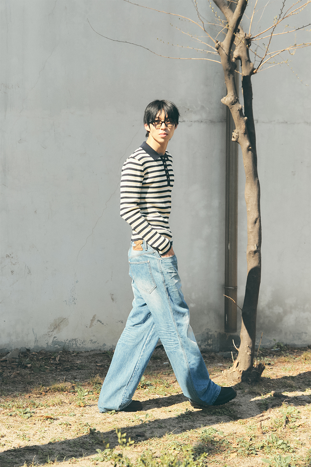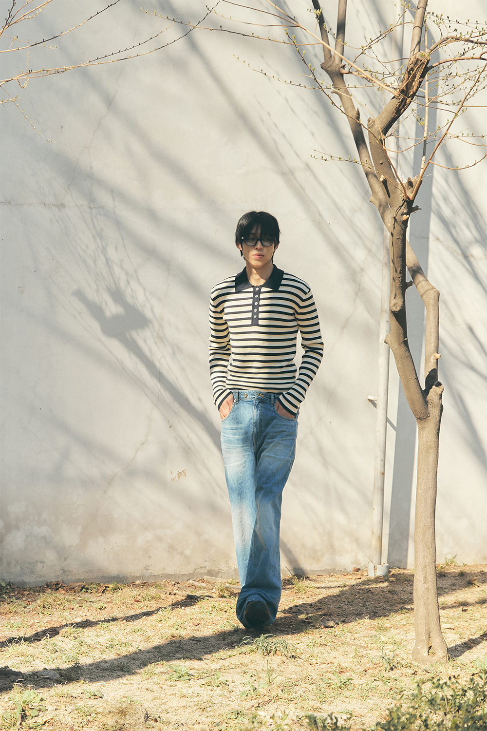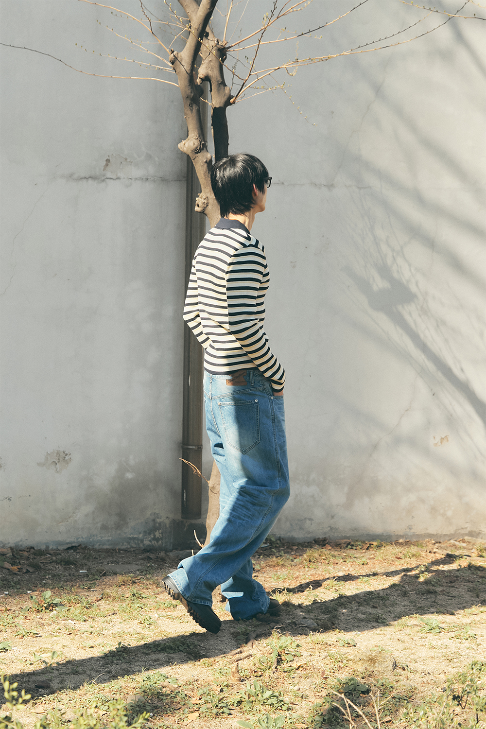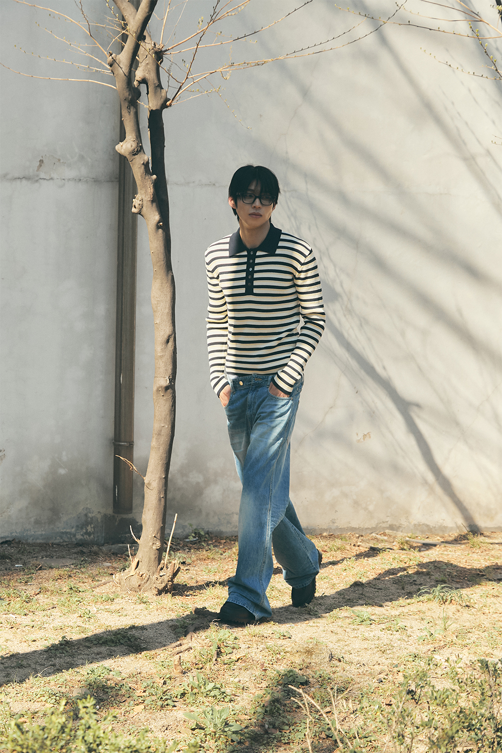 블루 선플라워 3 피스 스트라이프 칼라 롱 슬리브 니트웨어 네이비