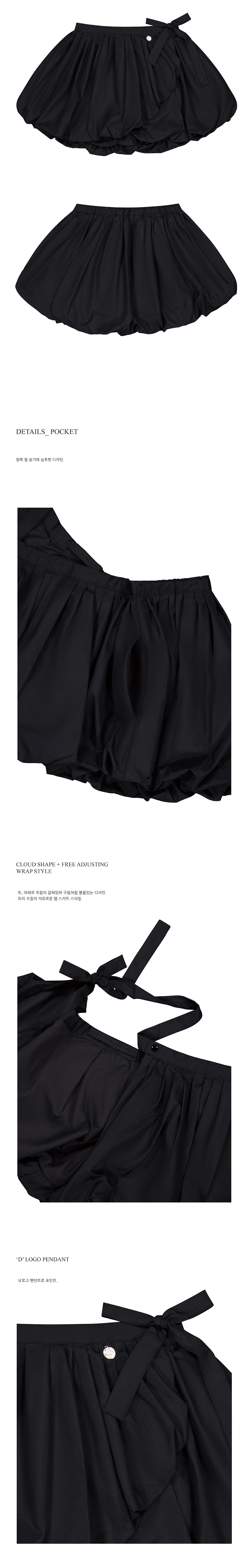 양쪽 옆 솔기 심포켓과 위아래로 잡힌 주름으로 볼륨감 있는 구름 디자인을 연출하며, 랩 스커트 스타일로 허리 조절이 자유로운 제품입니다.