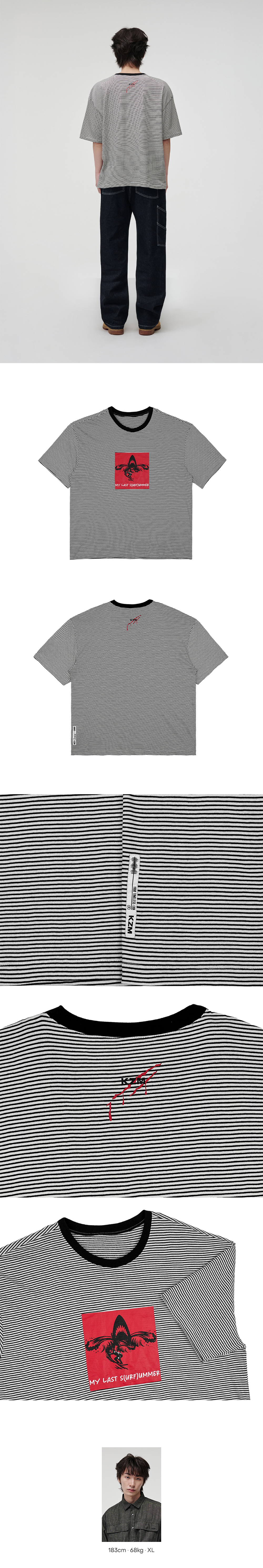 DETAILS ● 오버사이즈 핏 ● 적당한 두께의 20수 면100% 단가라 원단으로, 착용감이 편안한 오버사이즈 핏 반팔 ● 앞면 상어앞에서 서핑을 하는 위트있는 아트웍과 뒷면 KZM 아트웍 디자인 포인트 ● 앞/뒷면 나염 프린트 SIZE (단위: cm) ● M : 총장 66cm, 어깨 54cm, 가슴 57cm, 소매기장 19cm ● L : 총장 70.5cm, 어깨 58cm, 가슴 60cm, 소매기장 23.5cm ● XL : 총장 72.5cm, 어깨 60cm, 가슴 62.5cm, 소매기장 24cm ● 2XL : 총장 74.5cm, 어깨 62cm, 가슴 65cm, 소매기장 74.5cm ※ 측정 방법에 따라 ±1~2cm의 오차가 발생할 수 있습니다. ※ 색상은 모니터 해상도 및 사양에 따라 실제 제품과 다소 차이가 있을 수 있습니다.