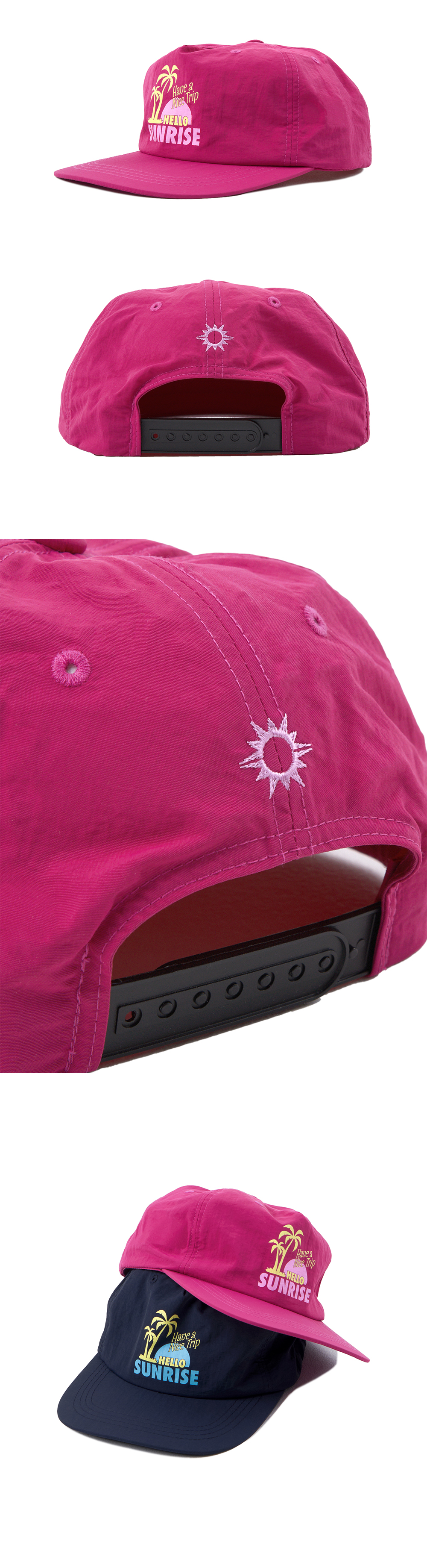 헬로선라이즈 90s Palm Tree 그래픽이 자수로 들어간 5패널 캡입니다. - 앞판 Palm Tree 그래픽 스크린 프린트 처리 - 나일론 원단 사용으로 시원한 소재감 - 사이즈 조절 스냅 - 릴렉스 핏으로 넉넉한 착용감 - 뒷판 Hello Sunrise 심볼 자수 처리 *모자의 챙을 개인적인 취향에 따라 원하시는 각도로 구부려 착용하시길 권장 드립니다. * Nylon 100% Made in Korea