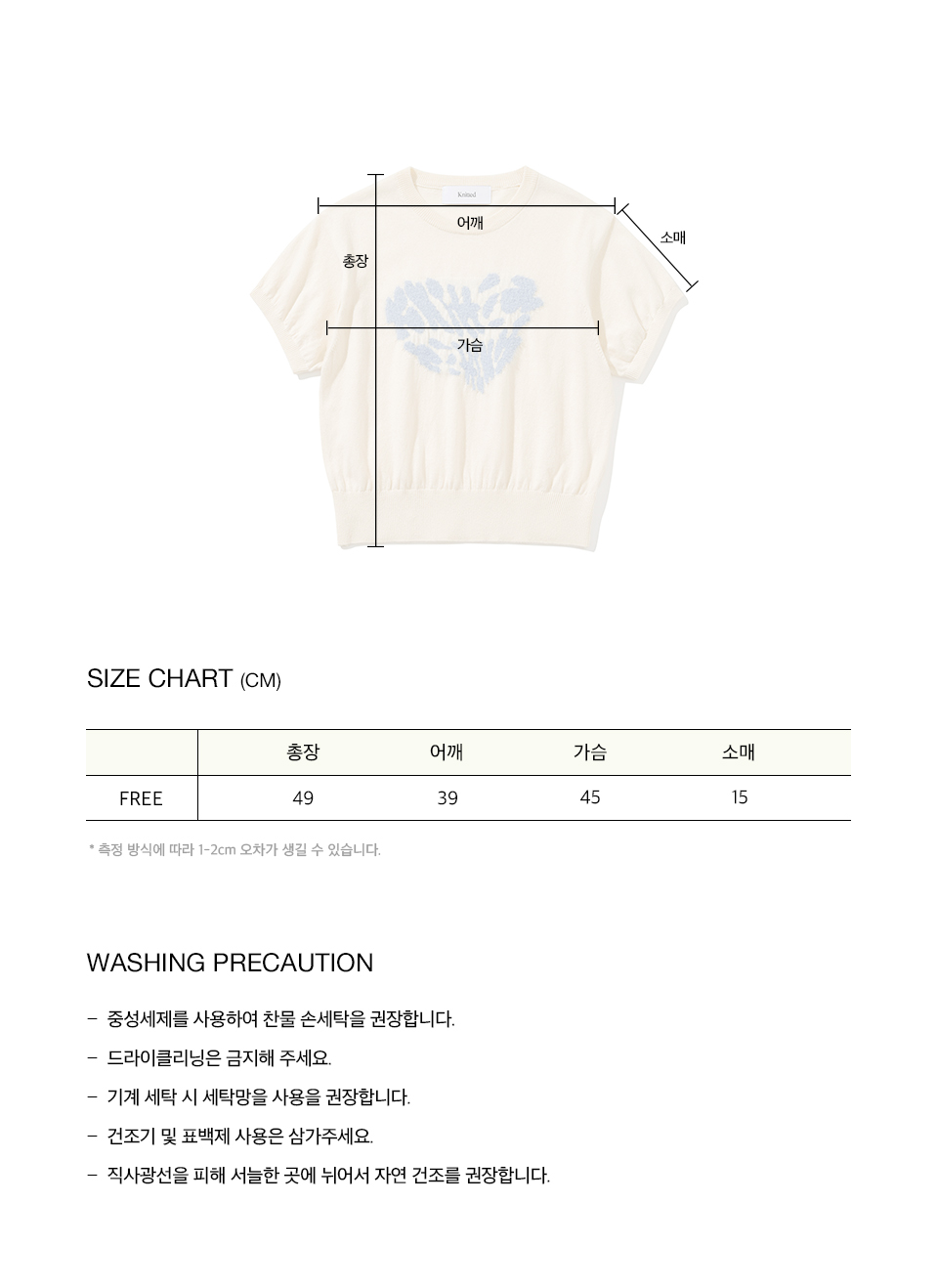 코튼 100% 원단으로 제작되어 부드러운 터치감으로 예민한 피부에도 부담 없이 착용 가능한 반팔 니트입니다. 전면의 그래픽 부분은 부드럽고 헤어리한 퍼 원사로 입체감을 주는 동시에 러블리한 무드를 더해주었습니다. 소매와 밑단은 볼륨감 있는 실루엣으로 연출되며 크롭 기장으로 제작되어 어떤 하의와 매치하여도 스타일리시하게 연출 가능한 니트입니다.