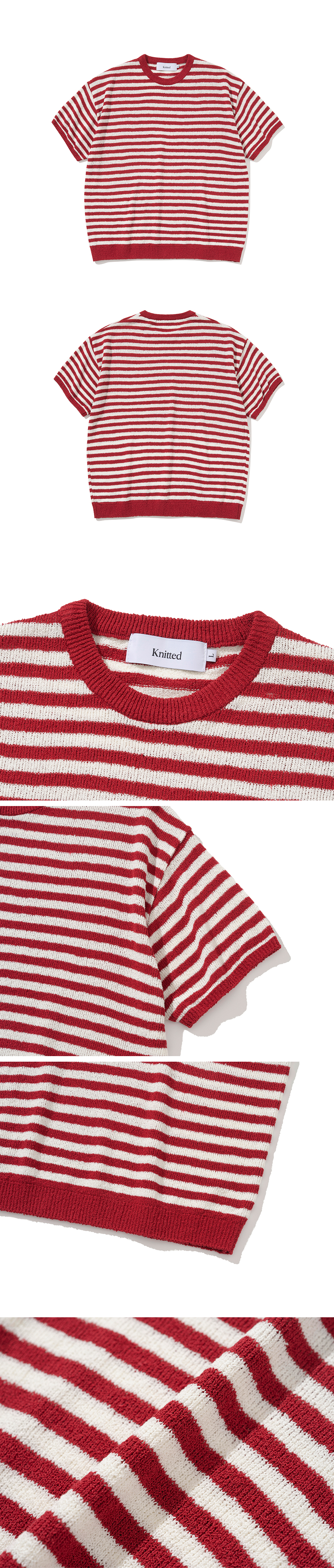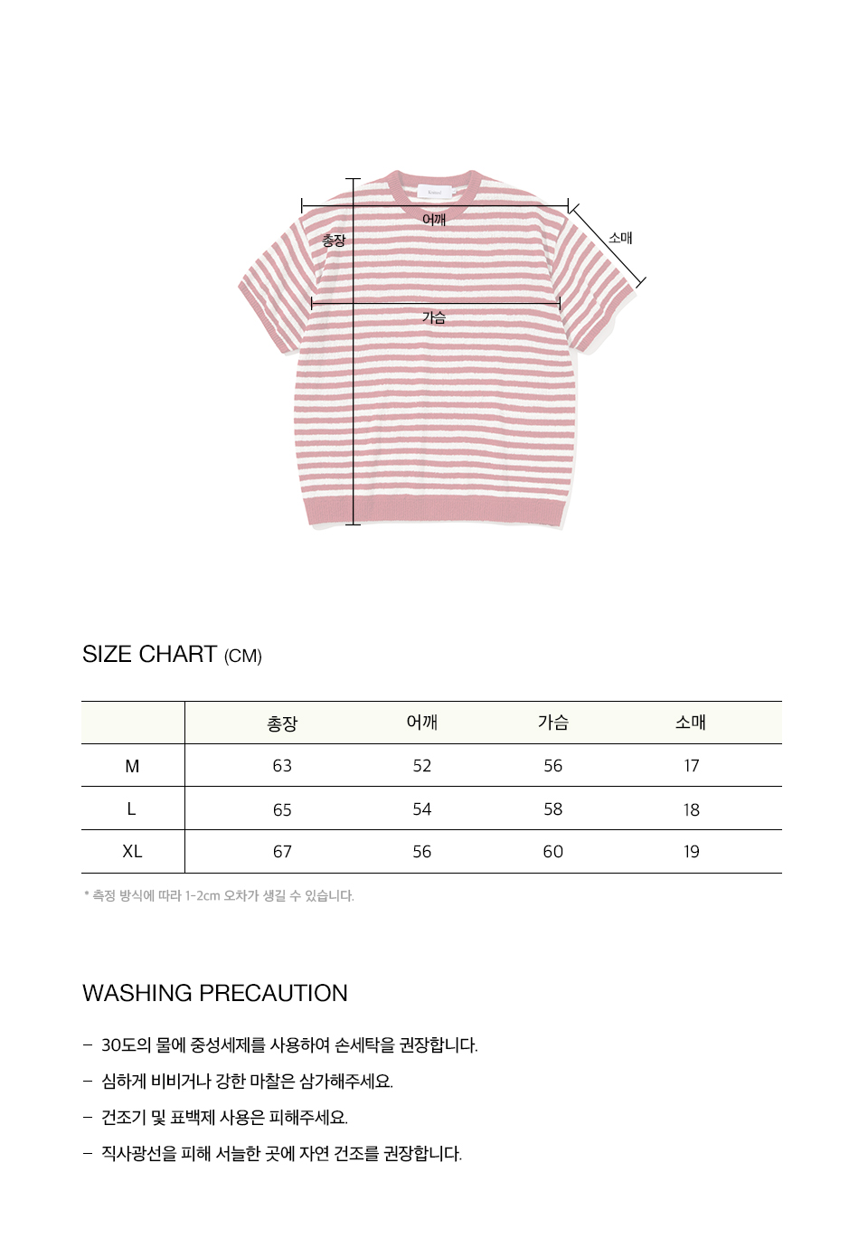 산뜻한 스트라이프 패턴의 반팔 니트입니다. 부클 텍스처의 아크릴 원사로 제작되어 보풀이 적으며 고슬고슬한 터치감으로 여름철에도 부담 없이 착용 가능합니다. 군더더기 없이 깔끔하게 떨어지는 실루엣으로 넣어 입지 않아도 깔끔하게 스타일링 가능하며 배색 디테일이 더해져 포인트가 되어줍니다.