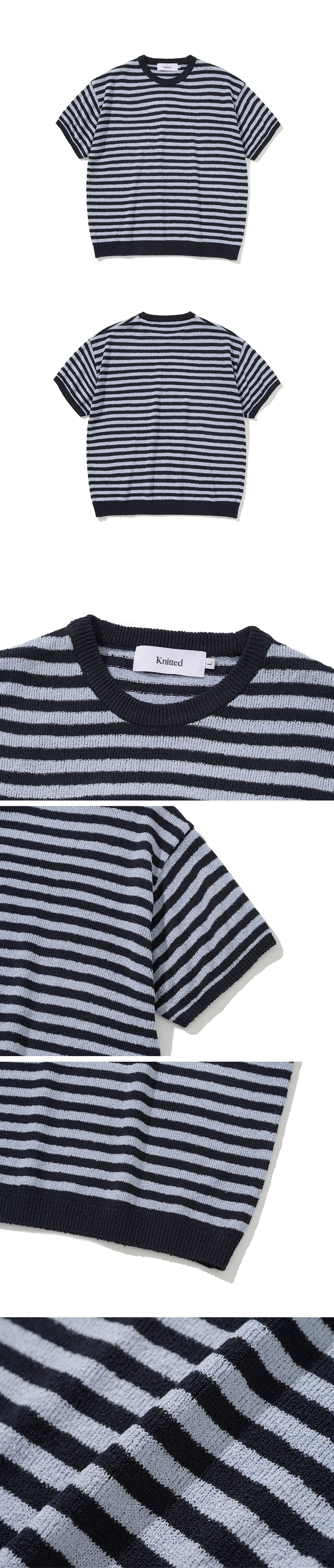 산뜻한 스트라이프 패턴의 반팔 니트입니다. 부클 텍스처의 아크릴 원사로 제작되어 보풀이 적으며 고슬고슬한 터치감으로 여름철에도 부담 없이 착용 가능합니다. 군더더기 없이 깔끔하게 떨어지는 실루엣으로 넣어 입지 않아도 깔끔하게 스타일링 가능하며 배색 디테일이 더해져 포인트가 되어줍니다.