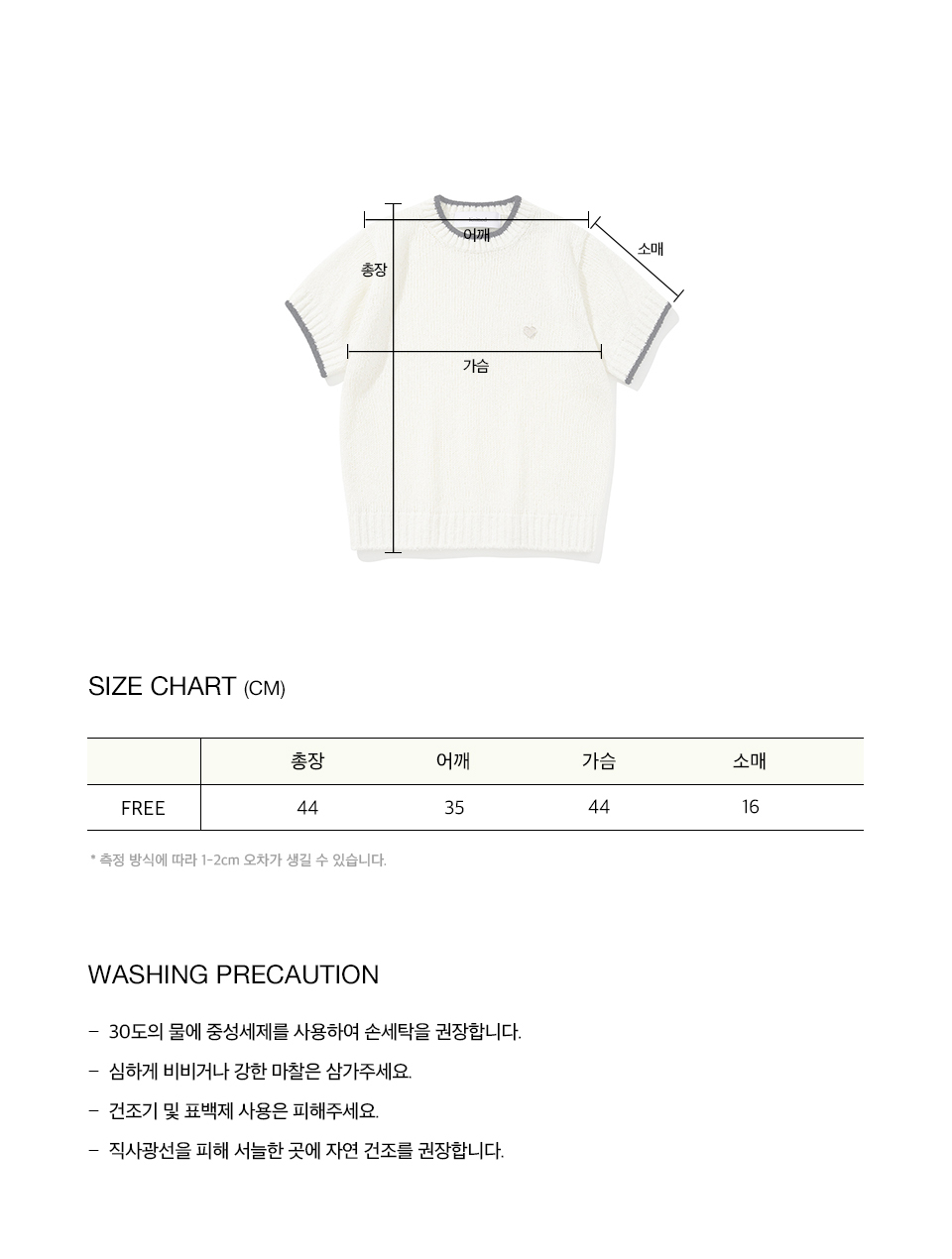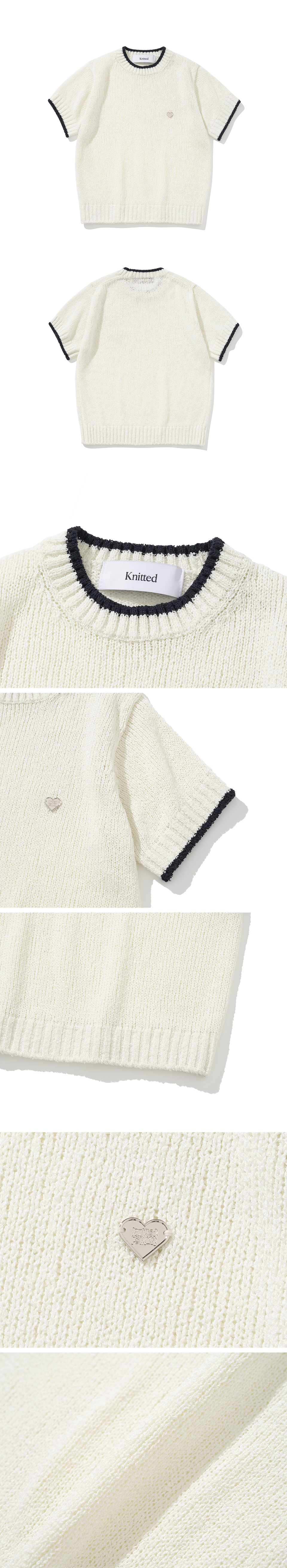 부클 텍스처의 아크릴 원사로 제작되어 보풀이 적으며 고슬고슬한 터치감으로 여름철에도 착용 가능한 반팔 니트입니다. 베이직한 디자인에 넥 라인과 소매의 배색과 하트 쉐입 금속 라벨로 포인트를 주어 단품 착용만으로도 유니크한 무드를 연출해 줍니다. 크롭 기장에 군더더기 없이 깔끔하게 떨어지는 실루엣으로 어떤 하의와 매치하여도 손쉽게 스타일링 가능한 제품입니다.