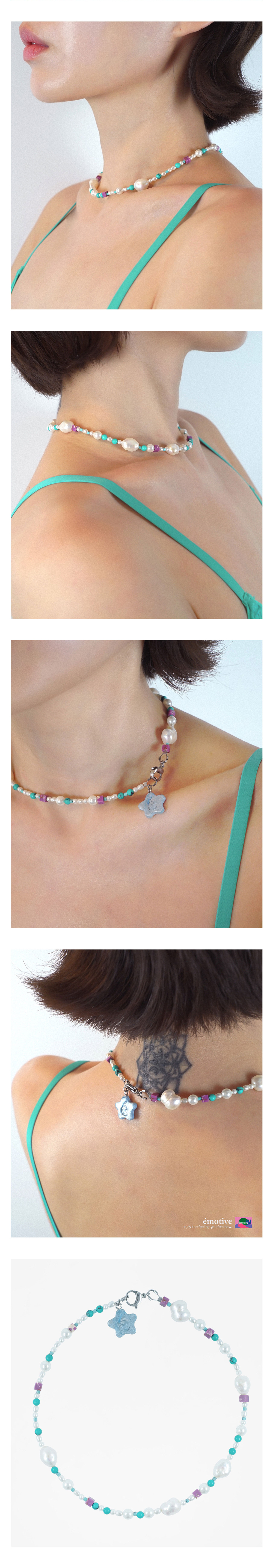 담수진주,핵진주,터키석,하울라이트 원석 캐주얼하고 키치한 무드 연출 * 핸드메이드 특성상 펜던트의 패턴이 다를 수 있습니다. - Material : pvc+resin+진주+원석+surgical - Size : 모델 사이즈 S 착용 / 진주 10mm,5mm,3mm 원석 4mm, 2mm