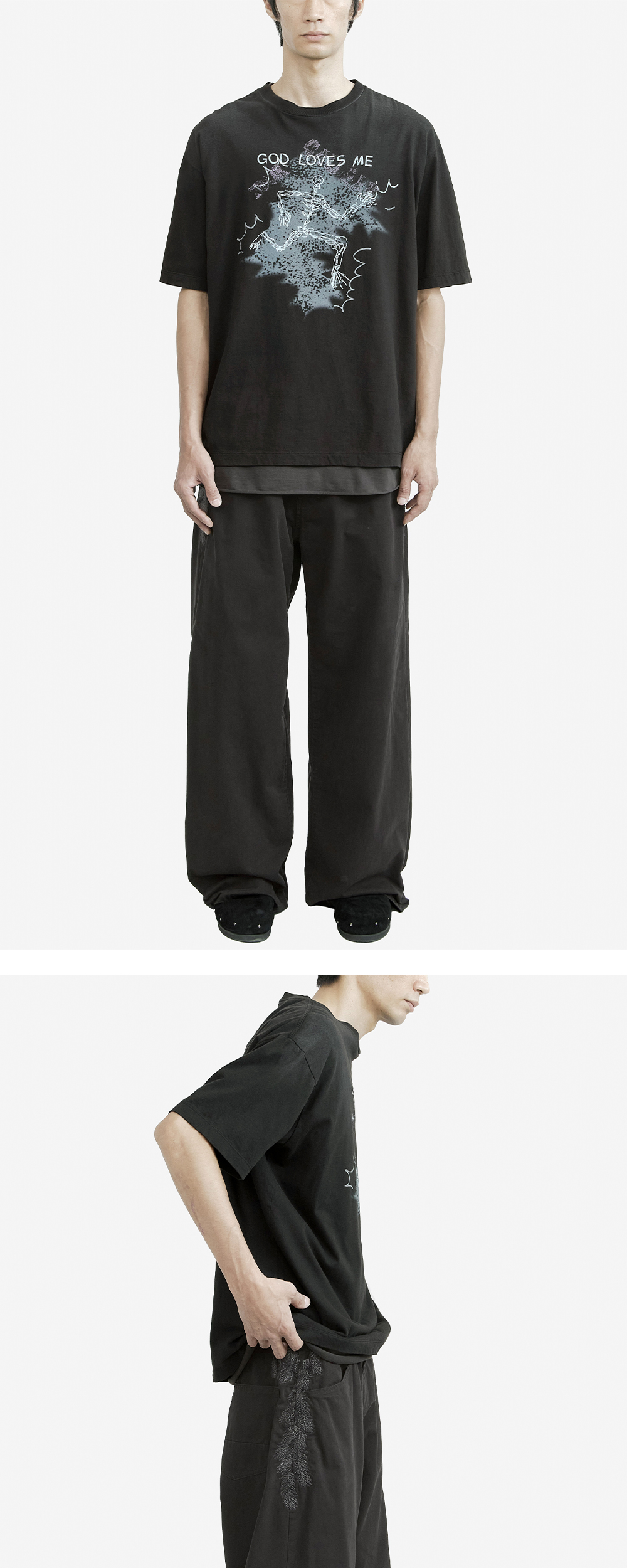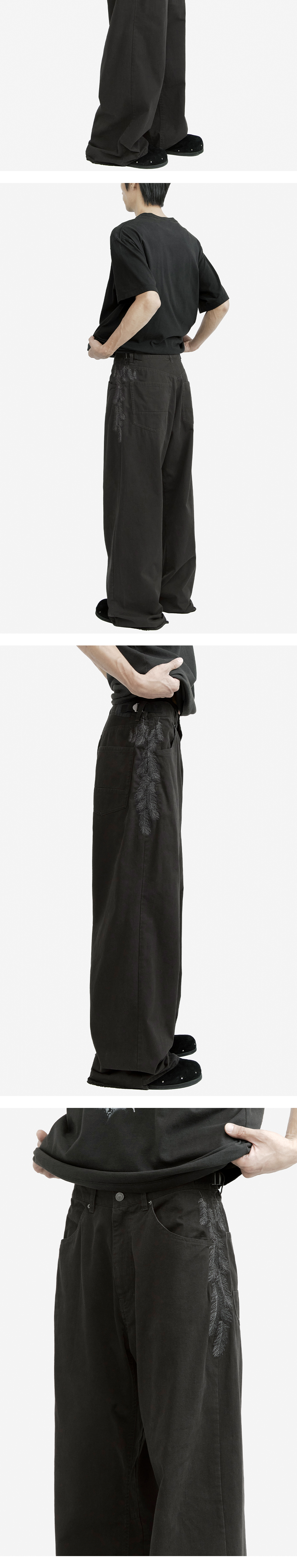 1011 feather gosima pants 1011 협업 컬렉션, 고시마 팬츠 2.0을 기반으로 허벅지 외측에 깃털 자수를 더해 높은 감도로 풀어낸 팬츠. 루즈한 플레어드 실루엣이 특징적으로, 전체적으로 넉넉하고 루즈하되 플레어-스트레이트-와이드 사이 절묘한 균형점을 찾아 새로운 노멀 실루엣을 추구합니다. 사이드 어드저스터, 불꽃놀이(하나비) 문양의 후면 패치. 밑단은 리빌드 형식으로 단차를 두었으며, 후면에는 올풀림 디테일을 적용하여 보다 러프한 분위기로 완성되었습니다. 직전 차수 대비, 금번 차수의 경우, 전체적으로 베이스 차콜이 약간의 빈티지한 브라운 빛이 가미된 차콜 컬러감으로 완성되었습니다. 본 제품은 직전 차수와 유사한 실측 및 착용감으로 제작되었습니다. 정확한 상세 사이즈의 경우, 실측표 확인 부탁드립니다. *가먼트 워싱 제품 특성상 생산 차수마다 색감이 조금씩 변경될 수 있습니다. *모델: 170 중반 / 마른 체형, 3사이즈 착용