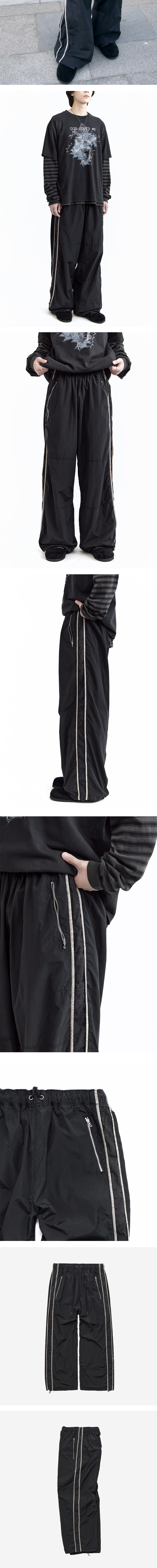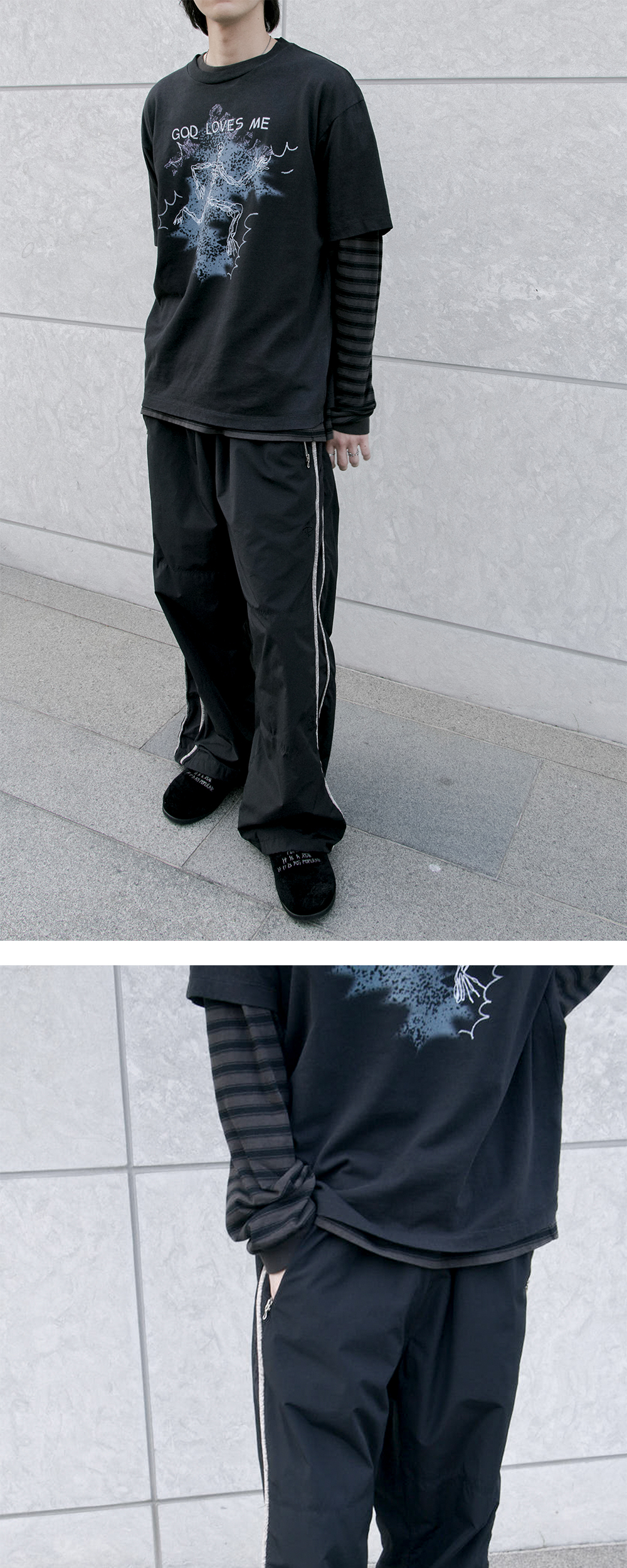 1011 nylon track pants floral piped - black 1011 협업 컬렉션, 나일론 트랙 팬츠의 사이드라인 파이핑과 배색감에 재패니즈 패브릭을 적용한 트랙 팬츠. 파이핑엔 플로럴 자카드 패턴의 재패니즈 패브릭, 배색감으로는 페이즐리 자카드 패턴의 재패니즈 패브릭과 요철감이 느껴지는 스트라이프 패턴의 원단을 채택하여 감도 높게 완성하였습니다. 유선형 슬라이드의 지퍼 포켓과 폴리테루 로고 자수 및 협업 그래픽 자수, 밑단 조절 가능한 스트링이 적용되었습니다. 가먼트 워시에 의해 본판은 자연스러운 터치 및 색감을 가지고 있으며, 사이드 라인은 더블 스티치를 따라 퍼커링이 형성되어 시각적으로 보다 강조됩니다. *모델: 170 후반 / 마른 체형, 3사이즈 착용 *직전 차수 제품 대비, 허리 조절 끈이 위치한 아일렛 부분을 덧댐 처리하여 변경 마감하였습니다.