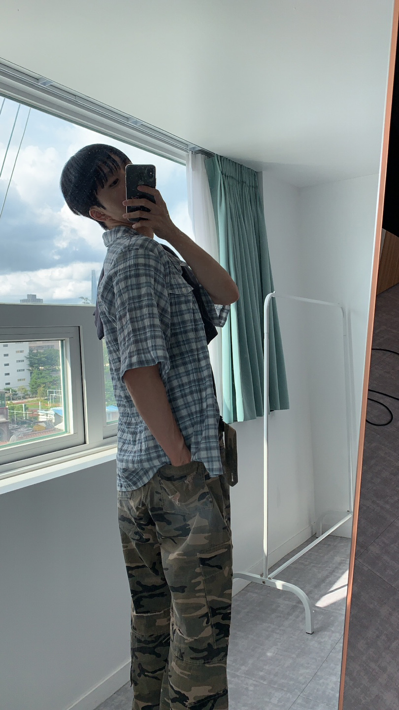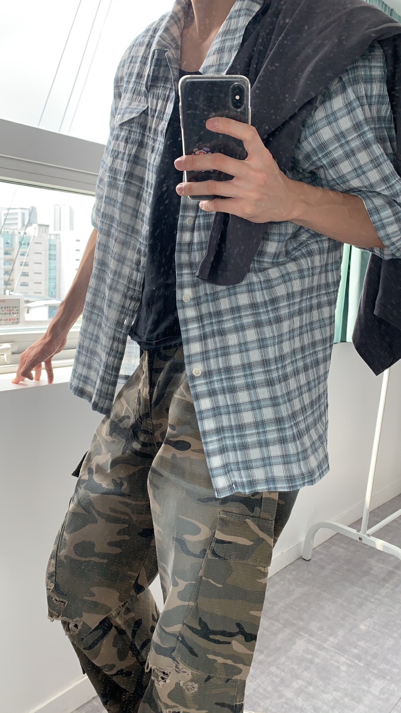 블루 선플라워 웨이비 체크 반팔 셔츠 블루