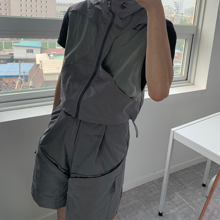 Blue Sunflower Utility Hooded Windbreaker Crop Vest Khaki Grey