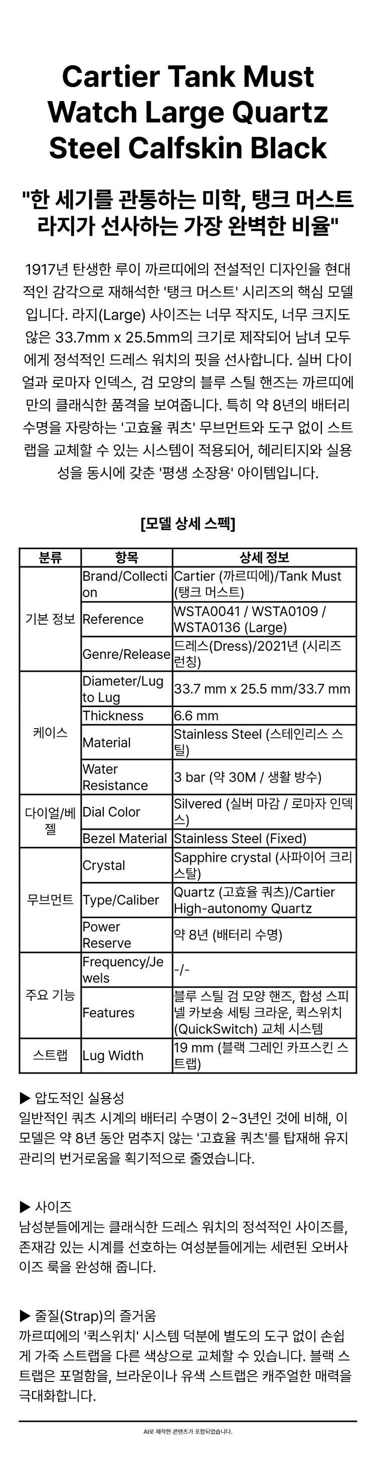 까르띠에 탱크 머스트 워치 라지 쿼츠 스틸 카프스킨 블랙