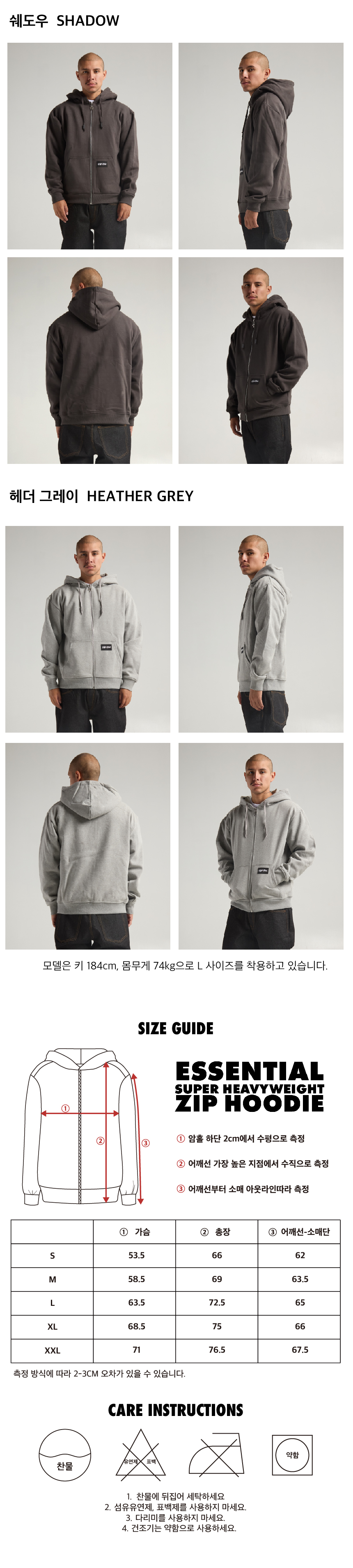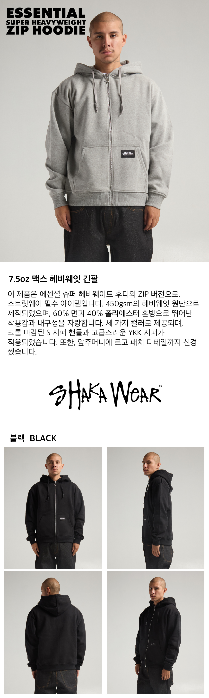 이 제품은 에센셜 슈퍼 헤비웨이트 후디의 ZIP 버전으로, 스트릿웨어 필수 아이템입니다. 450gsm의 헤비웨잇 원단으로 제작되었으며, 60% 면과 40% 폴리에스터 혼방으로 뛰어난 착용감과 내구성을 자랑합니다. 세 가지 컬러로 제공되며, 크롬 마감된 S 지퍼 핸들과 고급스러운 YKK 지퍼가 적용되었습니다. 또한, 앞 주머니에 로고 패치 디테일까지 신경 썼습니다.
