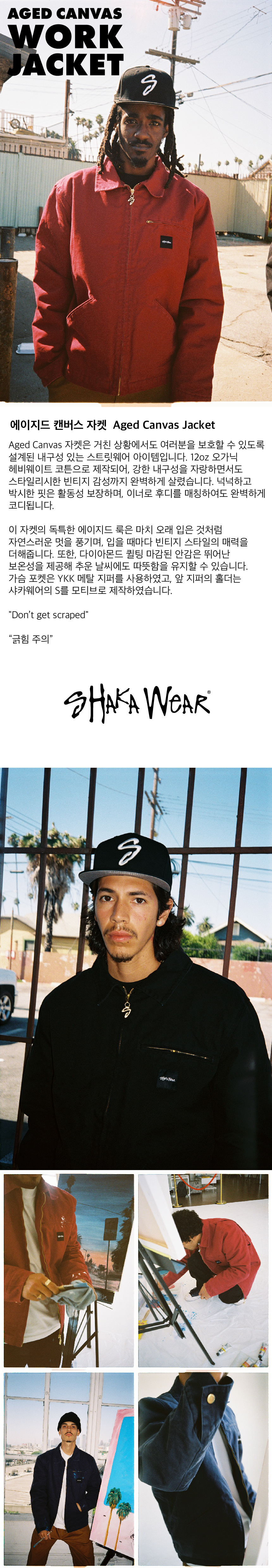 Aged Canvas 자켓은 거친 상황에서도 여러분을 보호할 수 있도록 설계된 내구성 있는 스트릿웨어 아이템입니다. 12oz 오가닉 헤비웨이트 코튼으로 제작되어, 강한 내구성을 자랑하면서도 스타일리시한 빈티지 감성까지 완벽하게 살렸습니다. 넉넉하고 박시한 핏은 활동성 보장하며, 이너로 후디를 매칭하여도 완벽하게 코디됩니다.이 자켓의 독특한 에이지드 룩은 마치 오래 입은 것처럼 자연스러운 멋을 풍기며, 입을 때마다 빈티지 스타일의 매력을 더해줍니다. 또한, 다이아몬드 퀼팅 마감된 안감은 뛰어난 보온성을 제공해 추운 날씨에도 따뜻함을 유지할 수 있습니다. 가슴 포켓은 YKK 메탈 지퍼를 사용하였고, 앞 지퍼의 홀더는 샤카웨어의 S를 모티브로 제작하였습니다."Don’t get scraped"“긁힘 주의”