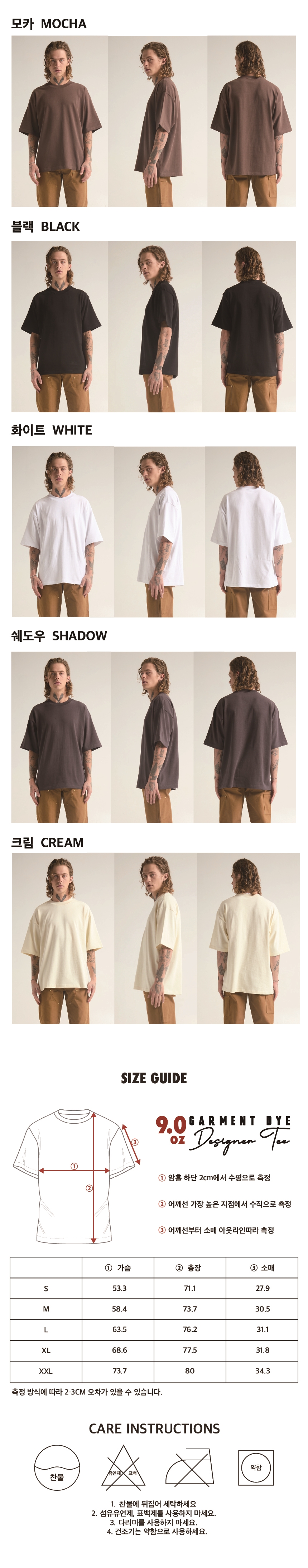 핏도, 원단도, 마감도 한층 더 완벽해졌습니다.트렌드를 반영한 박시한 실루엣에, 부담 없이 떨어지는 적당한 기장감, 드롭 숄더 디자인으로 자연스럽고 편안한 무드를 더했습니다. 탄탄한 9.0oz 헤비웨이트 원단을 이중 니팅(Double Knitting)으로 짜내 우수한 내구성과 흐트러지지 않는 핏을 선사합니다.또한, 완성된 옷에 컬러를 입히는 가먼트 워싱(Garment Washing) 기법을 적용하여 한층 더 부드러운 터치감과 자연스러운 마무리를 더했습니다.기존 디자이너 티에 사용되던 ACID 워싱은 빠져, 보다 깨끗하고 선명한 솔리드 컬러감을 구현해 티셔츠 하나만으로도 깔끔하고 세련된 스타일링이 가능합니다.단순한 티셔츠를 넘어, 매일 입고 싶은 완성형 실루엣.지금, 새로워진 디자이너 9.0oz 티셔츠를 만나보세요.