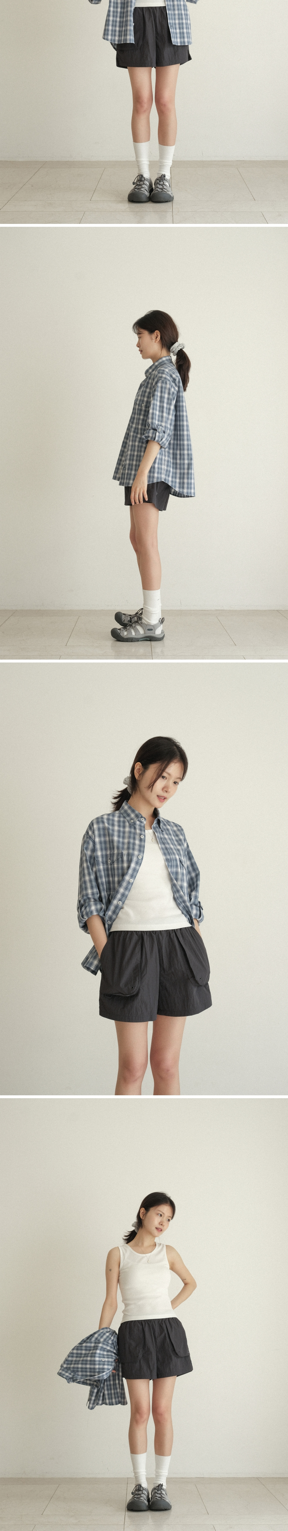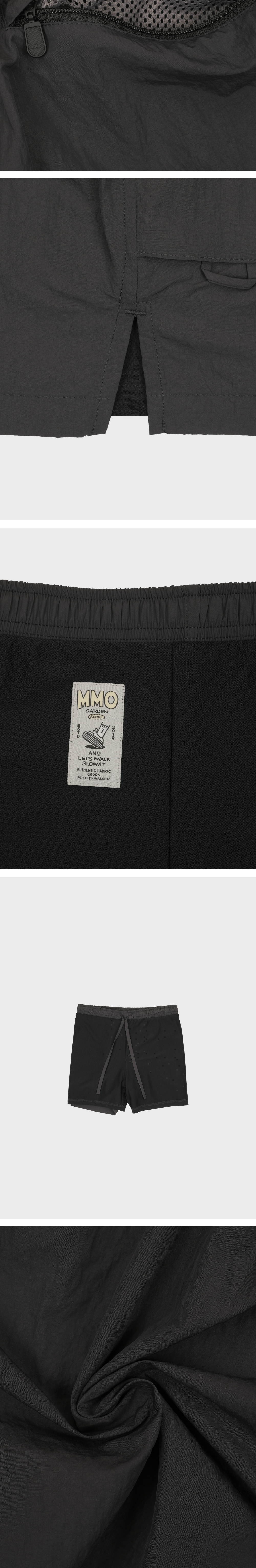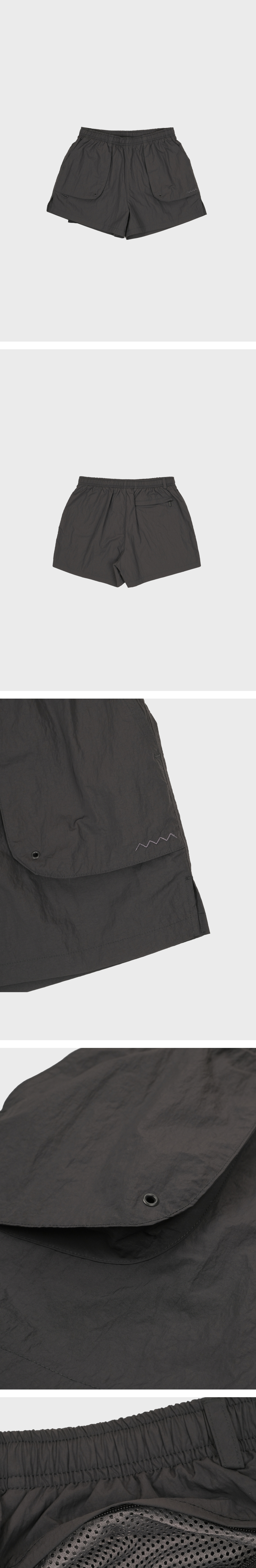 -가볍고 자연스러운 주름이 있는 나일론 원단으로 빠른 건조가 특징 -내구성과 통기성이 좋고 신축성이 우수한 레깅스 소재의 안감으로 더운 날에도 산뜻하게 착용 가능 -투인원 쇼츠로 짧은 기장감의 부담을 줄이고 몸에 감기는 느낌이 좋게 제작 -입체감이 있는 에메모만의 패턴 앞 포켓 -가벼운 소지품을 걸 수 있도록 뒷면 허리 벨트와 오른쪽 앞 포켓 하단에 고리 부착 -일상과 여행, 가벼운 운동, 수영복으로도 활용 가능 무더운 여름, 언제든 물가로 뛰어들어도 괜찮아요! color : brown, charcoal, gray fabric : 겉감 : nylon 100% 안감 : nylon 78%, polyurethane 22% 포켓 : polyester 100% materials : ykk zipper, ykk eyelet model : w 162 / 42 (1 size) m 176 / 65 (3 size)