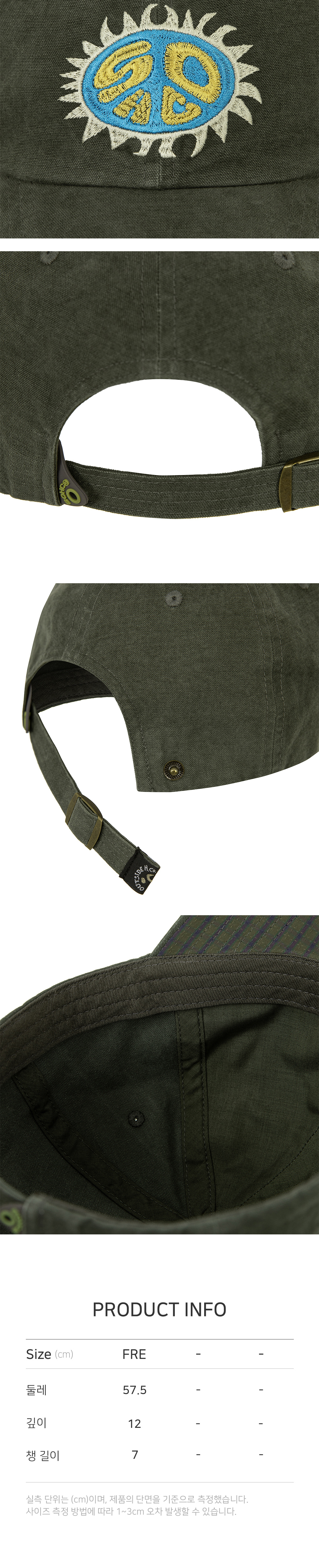 기념품 숍 컨셉의 태양 아트워크와 PEACE 사인 형태의 SOHC 레터링 그래픽, 후면 실리콘 라벨, 워싱 마감이 특징인 캡입니다.