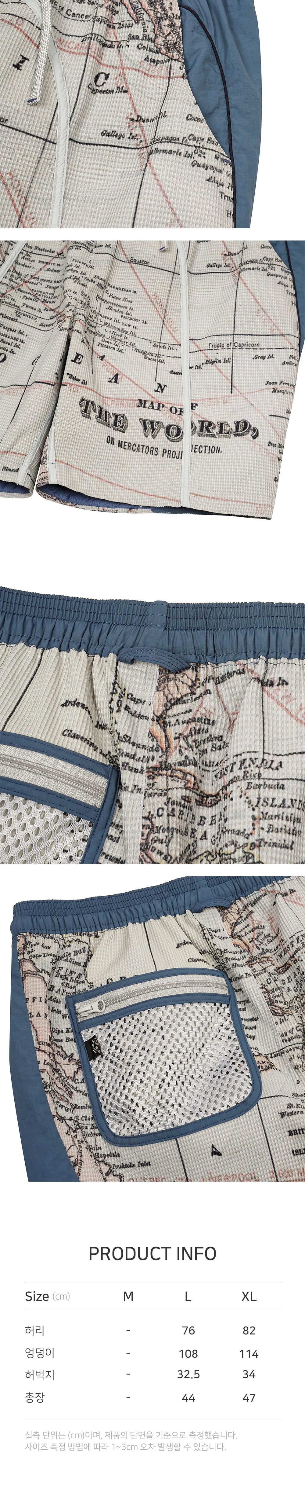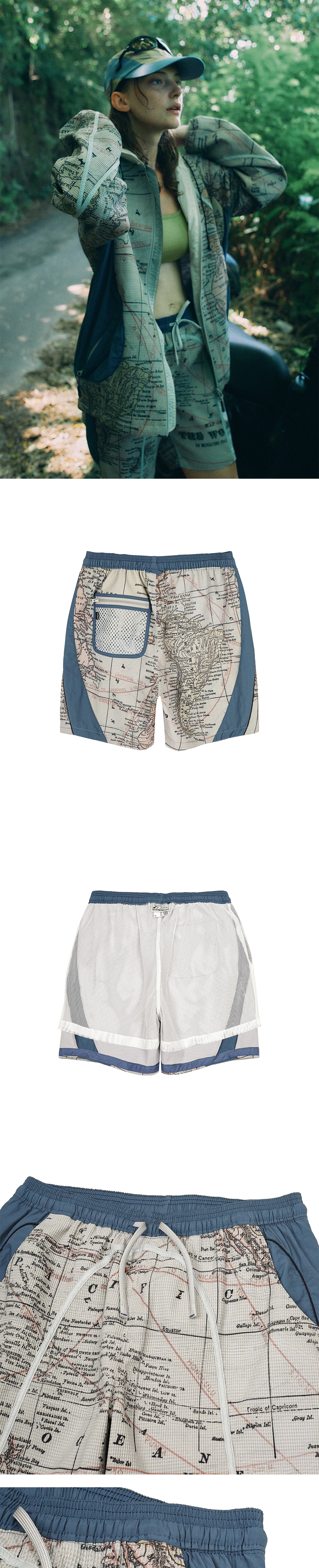 1901년 George F. Cram의 세계지도에서 영감을 받은 그래픽과 블루 포켓 디테일, 와플 텍스처 원단, YKK® 나일론 지퍼가 특징인 프린티드 쇼츠입니다.