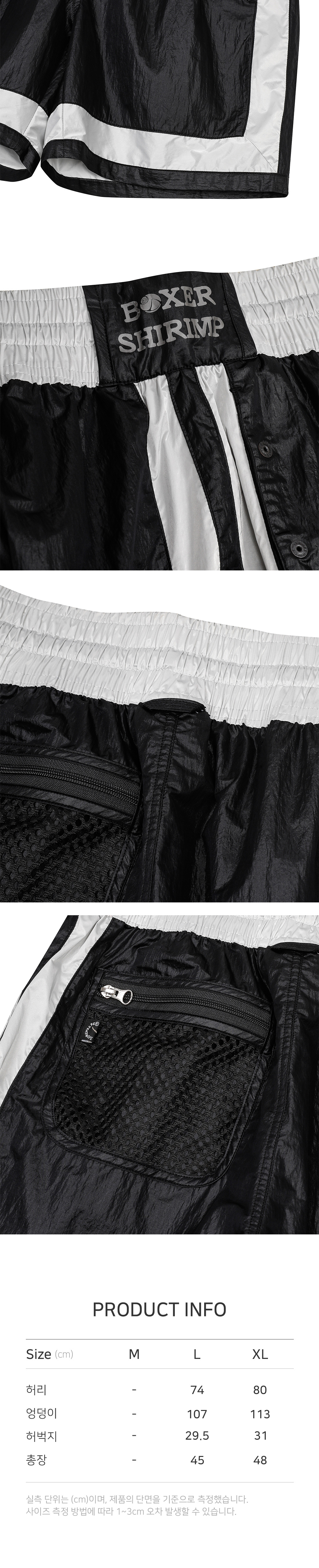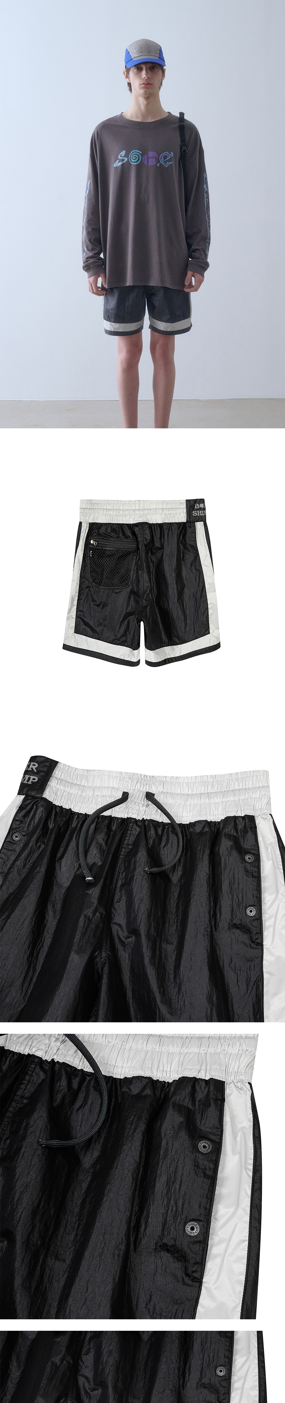 발리 지역의 ‘맨티스 쉬림프’에서 영감을 받은 복싱 쇼츠 컨셉으로, 허리 밴드의 BOXER Shrimp 레터링과 일러스트, 메시 소재의 백 포켓, 버튼 여밈 전면 포켓, YKK® 나일론 지퍼가 특징인 버뮤다 쇼츠입니다.