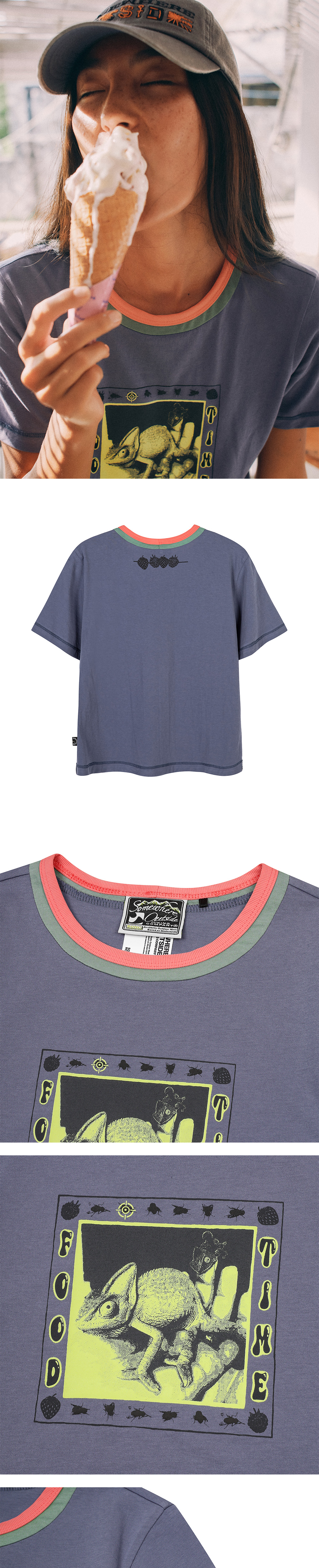 카멜레온의 식사 시간’을 테마로 한 등판 딸기꼬치 SOHC 레터링 그래픽과 배색 이중 레이어 넥라인 디테일이 특징인 아트워크 티셔츠입니다.