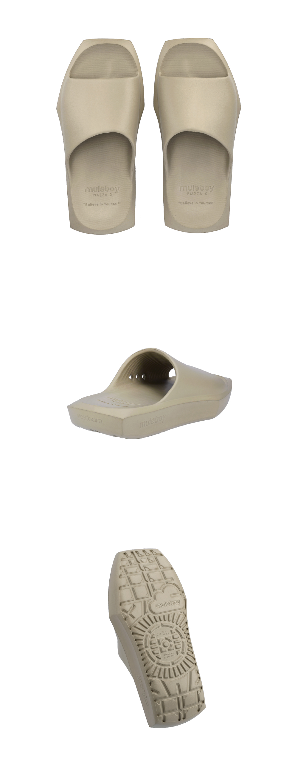 피아차 엑스는 구두 실루엣의 슬라이드입니다. '피아차'는 '광장'을 뜻하는 이태리어로, SQUARE(광장)의 더 넓은 공간적 의미를 담아냅니다. 발바닥 패턴은 로마 바티칸 시티의 성 베드로(San Pietro)를 상징합니다. 갑피 안쪽에는 논슬립 패턴과 발등 통기를 위한 3-holes이 적용되어 있습니다.