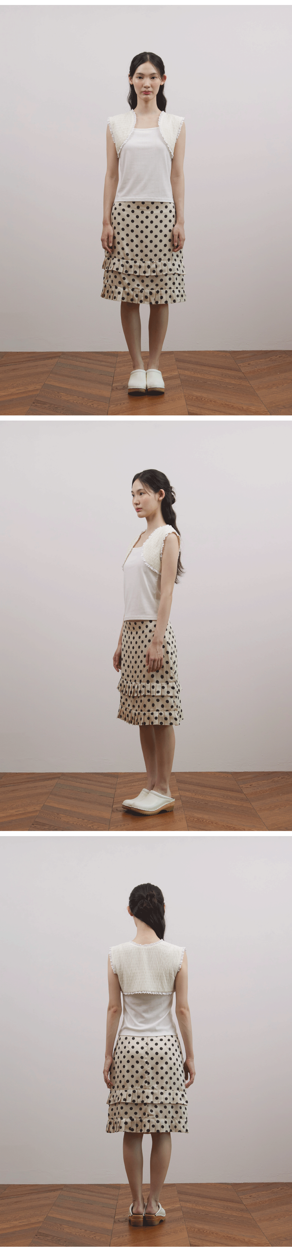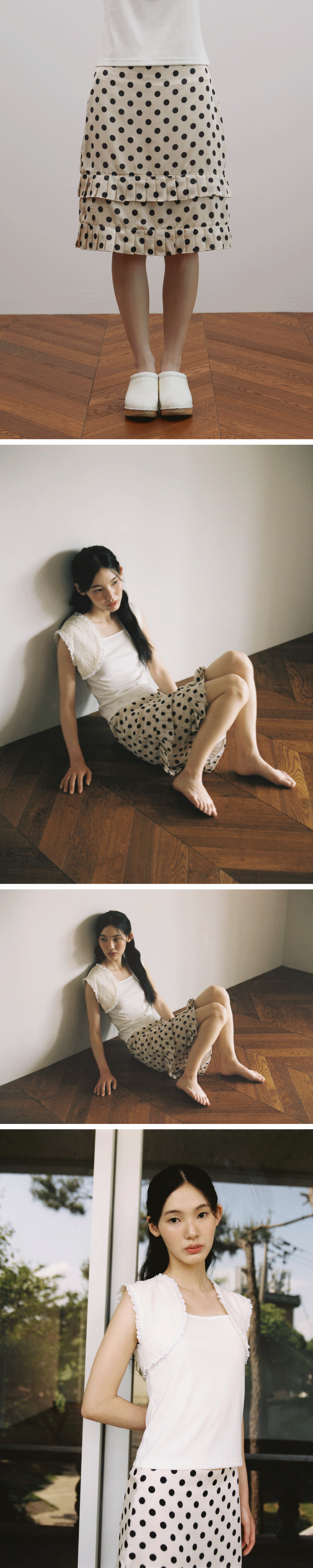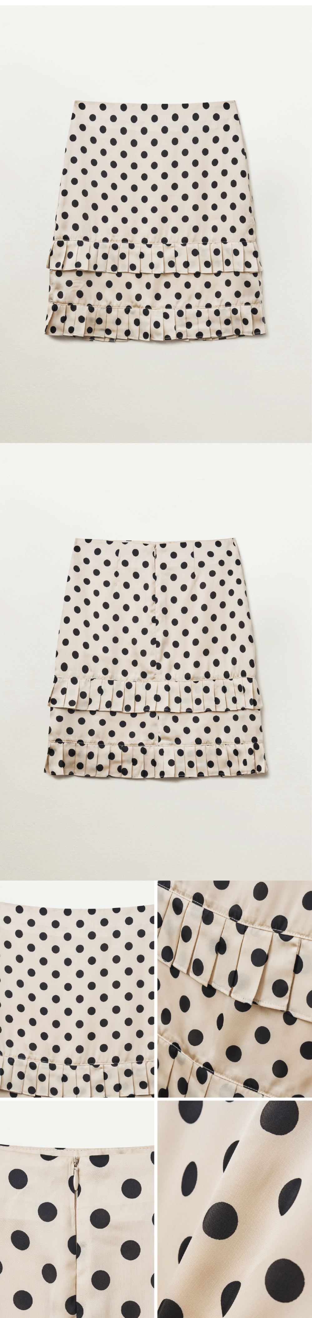 - 도트 패턴의 미디움 기장 스커트 - 허리 뒷 중심 지퍼 여밈 - 하단부 2단 외주름 디자인 *착용법: 허리 뒷 중심에 지퍼가 위치하도록 착용. POLYESTER 100 드라이클리닝 권장 (건조기 사용 금지)