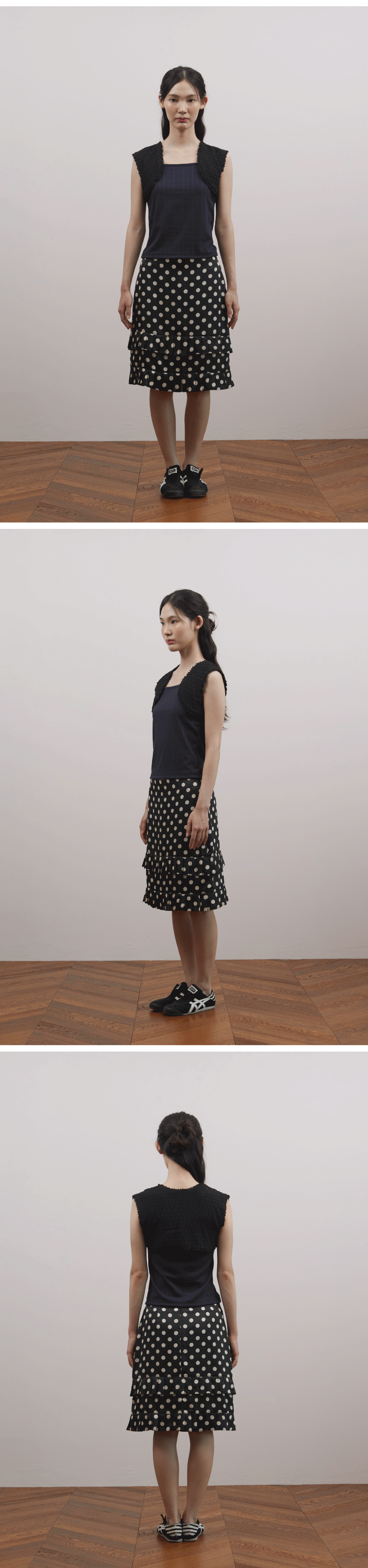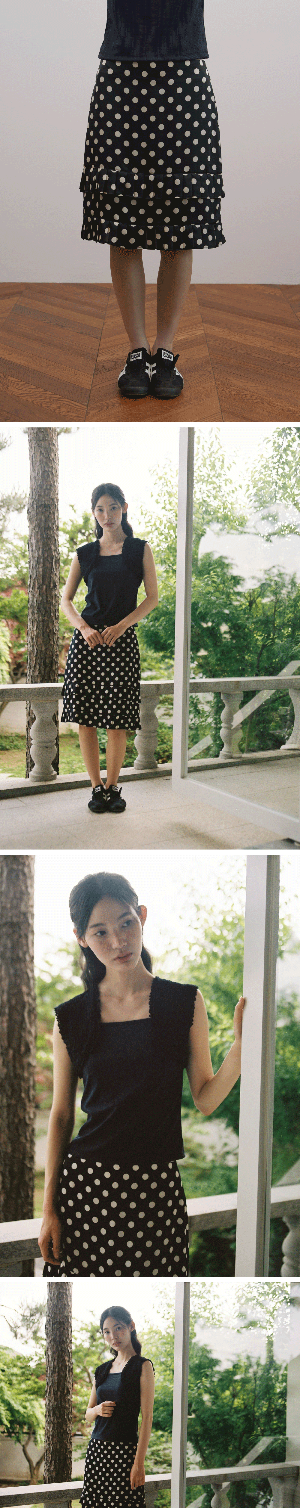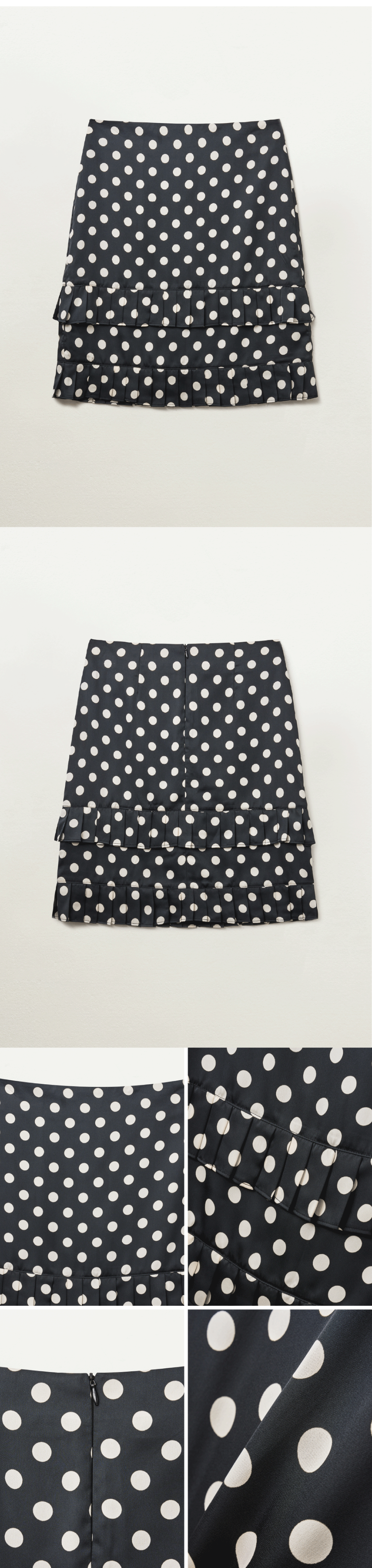- 도트 패턴의 미디움 기장 스커트 - 허리 뒷 중심 지퍼 여밈 - 하단부 2단 외주름 디자인 *착용법: 허리 뒷 중심에 지퍼가 위치하도록 착용. POLYESTER 100 드라이클리닝 권장 (건조기 사용 금지)