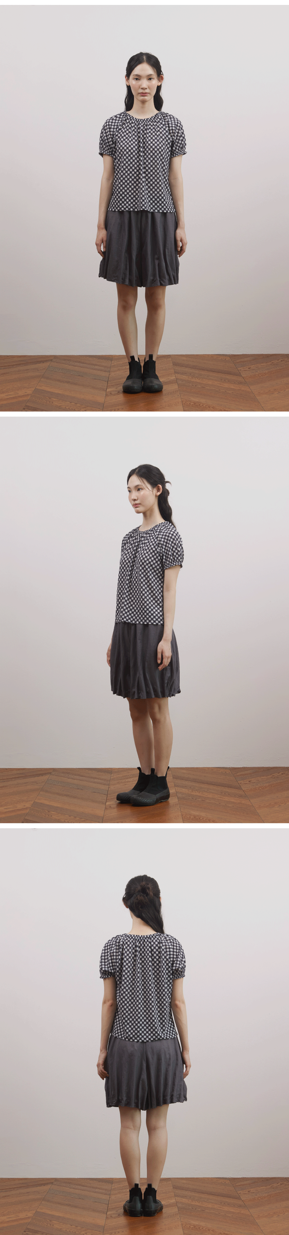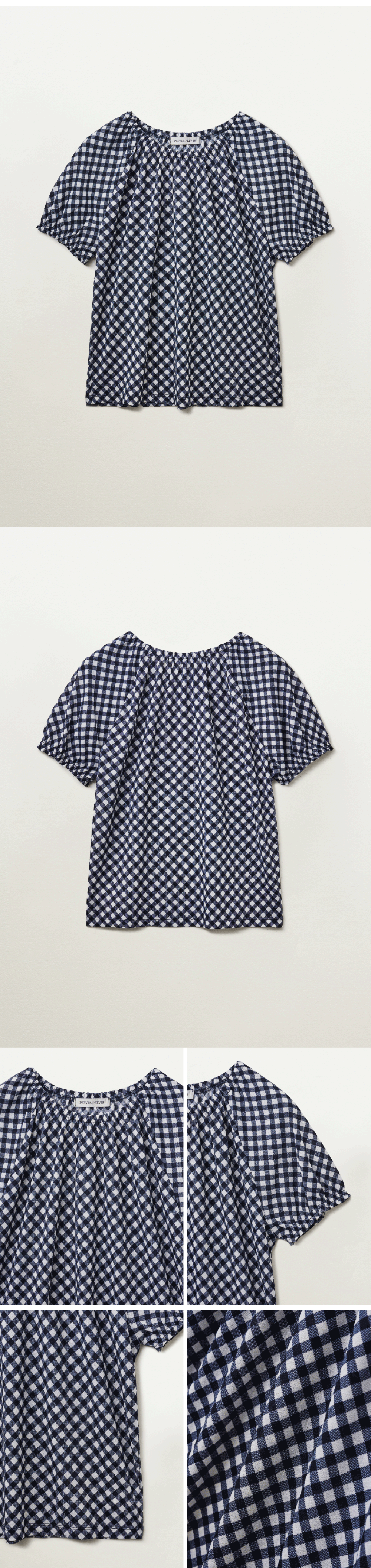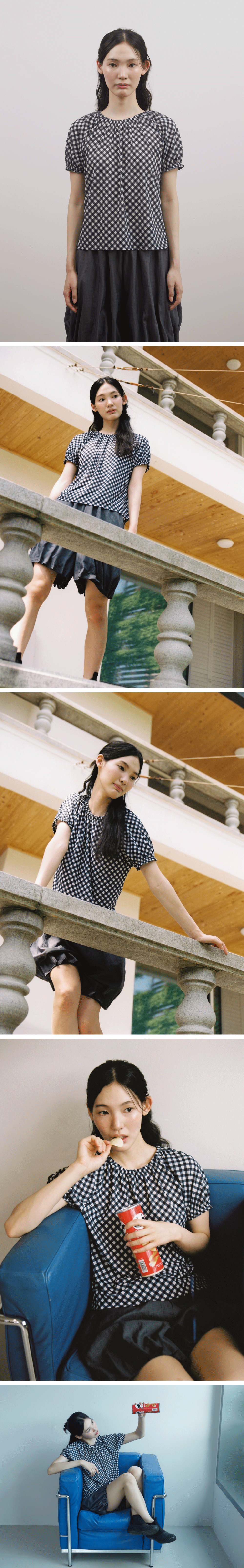 - 체크 패턴 원단의 퍼프 소매 탑 - 넥라인 전체 셔링 및 밴드 - 퍼프 슬리브 헴 밴딩으로 편한 착용감 - 우수한 통기성 POLYESTER 95 SPAN 5 드라이클리닝 권장 (건조기 사용 금지)