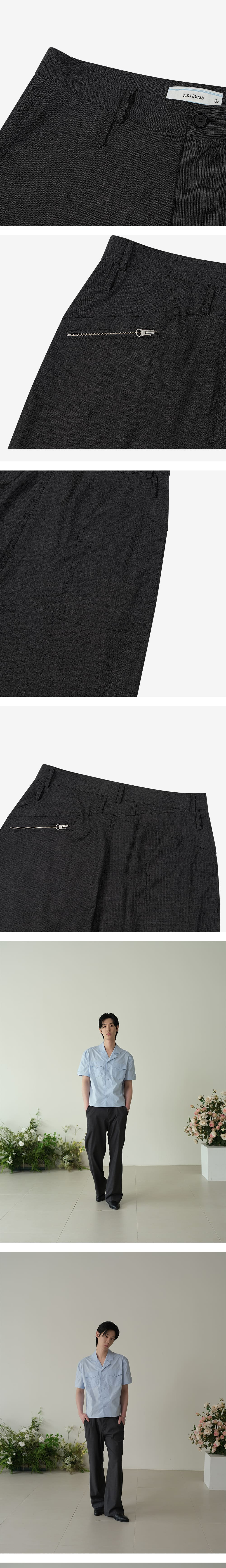 - 컬러마다 다르게 셀렉되어 제작된 데드스탁 섬머 울 패브릭 - 섹시한 분위기의 스트레이트 실루엣 - 전면부 포켓 덮개 디테일 - 레이어드 벨트 고리 디테일 - 후면부 웨이비니스 시그니처 디테일 - YKK ZIPPER - 웨이비니스 로고 각인 소뿔 단추 - 내부 봉제 파이핑 작업 - Color Charcoal, Black, Brown - Outshell Charcoal : Wool 97%, Span 3% Black : Wool 100% Brown : Wool 100% - SIZE 1 : 허리 39 허벅지 33 밑단 26 밑위 31 총장 110 2 : 허리 41 허벅지 34 밑단 27 밑위 31.5 총장 111 3 : 허리 43 허벅지 45 밑단 28 밑위 32 총장 112 MODEL 183cm 66kg 186cm 68kg 184cm 63kg 2SIZE 착용