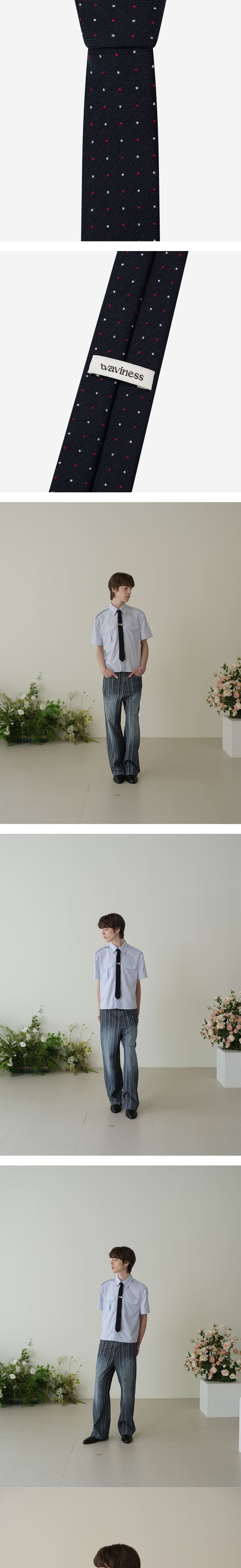 - 데드스탁 울 패브릭 - 은은하게 표현된 패턴 - 슬림타이 형태로 제작 - 여러 사이즈의 넥타이 샘플링을 통해 웨이비니스의 시그니처 라인 셔츠들과 가장 호환성이 좋다고 판단되는 대검 50mm, 소검 38mm로 제작 - Color Charcoal Check, Navy Dot - Outshell Charcoal Check : Wool 100% Navy Dot : Wool 50%, Rayon 46%, Cotton 4% - SIZE 소검 : 38mm 대검 : 50mm 길이 : 150cm MODEL 183cm 66kg FREE SIZE 착용 186cm 68kg FREE SIZE 착용 184cm 63kg FREE SIZE 착용