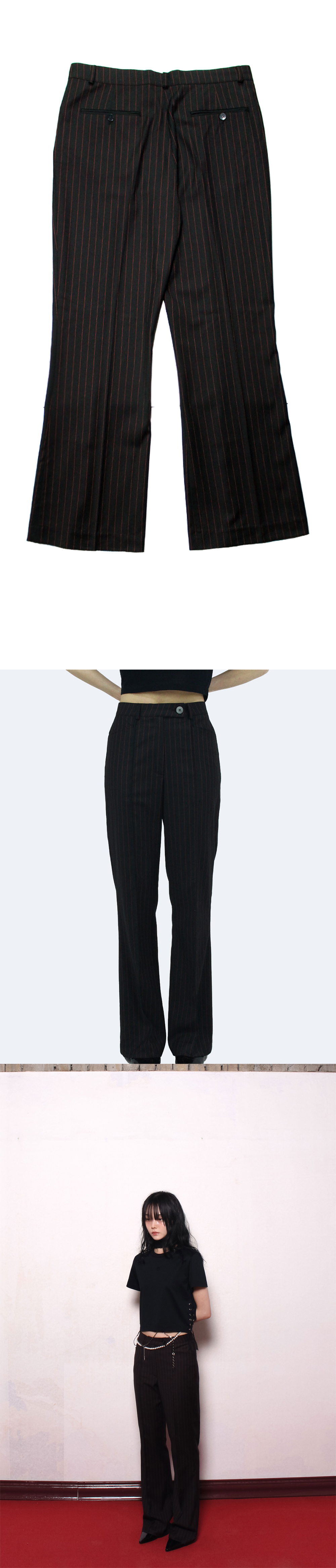 - 은은한 광택이 도는 차가운 촉감의 원단 - 레드 핀스트라이프 패턴 - 세미 플레어 핏 - 핀치드 심 디테일