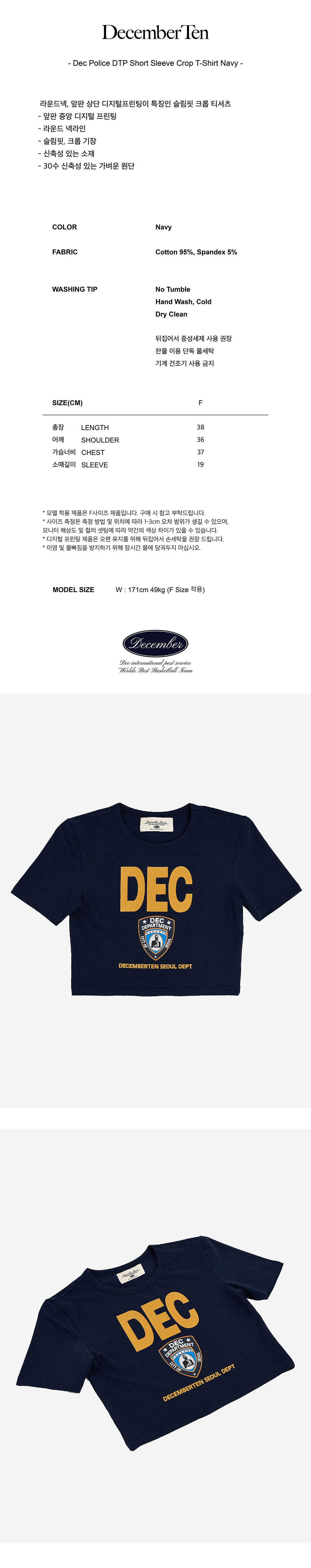 December Ten DEC Police DTP Short Sleeve Crop T-Shirt 폴리스 디티피 숏슬리브 크롭 티셔츠 Color : White/Navy Detail 라운드넥, 앞판 상단 DTP, 짧은 기장의 슬림핏 티셔츠 - 앞판 상단 디지털 프린팅 인쇄 - 라운드 넥라인 - 슬림핏, 크롭 기장 - 신축성 있는 소재 - 30수 신축성 있는 가벼운 원단 - Cotton 95% / Span 5% Cleanning - 중성세제 기계세탁 가능 - 기계 건조기 사용 금지 - 손세탁 권장 Size Free Length : 38cm Shoulder: 36cm Chest : 37cm Model Size W: Height 171cm 49kg ( Free Size ) 제조자: 디셈버텐 제조국: 대한민국 제조년월: 25년 5월 품질보증기준: 본 제품은 공정거래위원회 고시 소비자 분쟁해결기준에 의거 보상받으실 수 있습니다. A/S: 02-743-7514