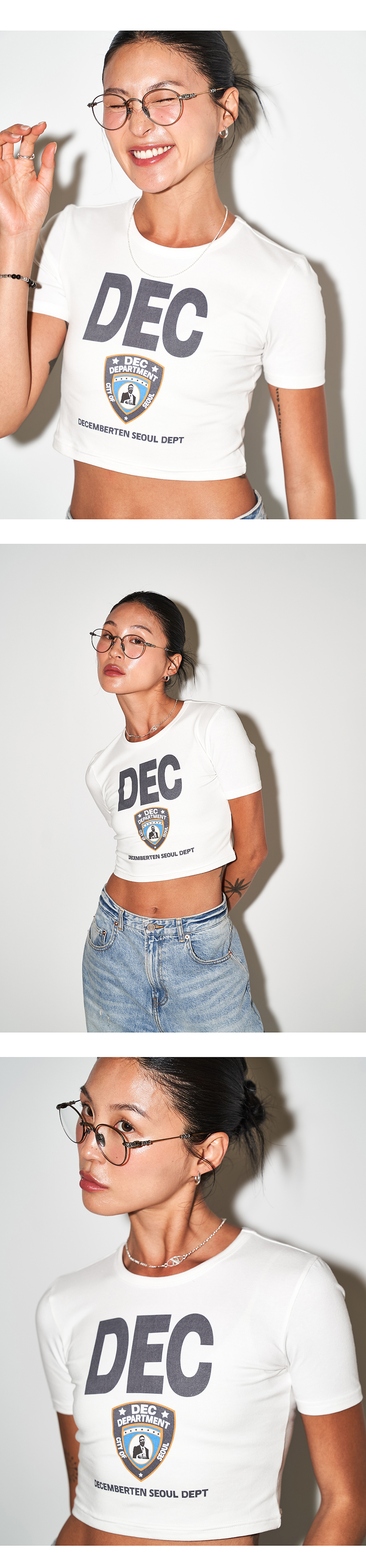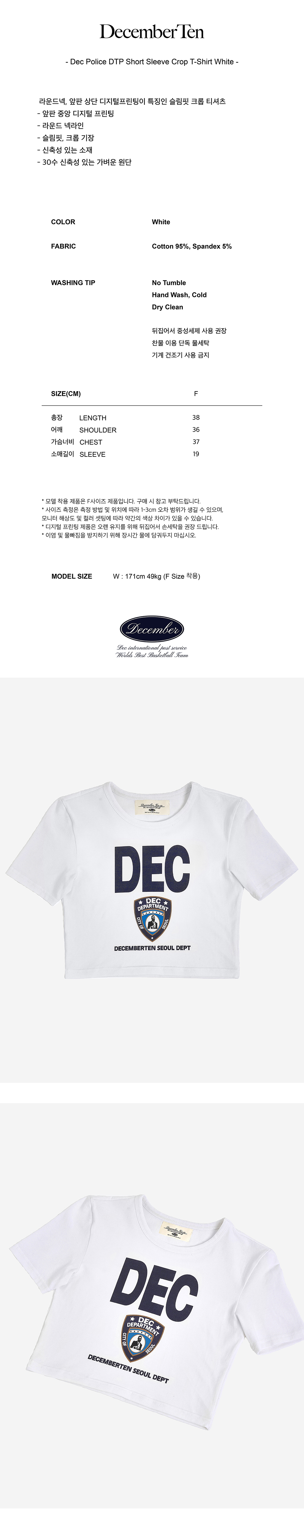 December Ten DEC Police DTP Short Sleeve Crop T-Shirt 폴리스 디티피 숏슬리브 크롭 티셔츠 Color : White/Navy Detail 라운드넥, 앞판 상단 DTP, 짧은 기장의 슬림핏 티셔츠 - 앞판 상단 디지털 프린팅 인쇄 - 라운드 넥라인 - 슬림핏, 크롭 기장 - 신축성 있는 소재 - 30수 신축성 있는 가벼운 원단 - Cotton 95% / Span 5% Cleanning - 중성세제 기계세탁 가능 - 기계 건조기 사용 금지 - 손세탁 권장 Size Free Length : 38cm Shoulder: 36cm Chest : 37cm Model Size W: Height 171cm 49kg ( Free Size ) 제조자: 디셈버텐 제조국: 대한민국 제조년월: 25년 5월 품질보증기준: 본 제품은 공정거래위원회 고시 소비자 분쟁해결기준에 의거 보상받으실 수 있습니다. A/S: 02-743-7514
