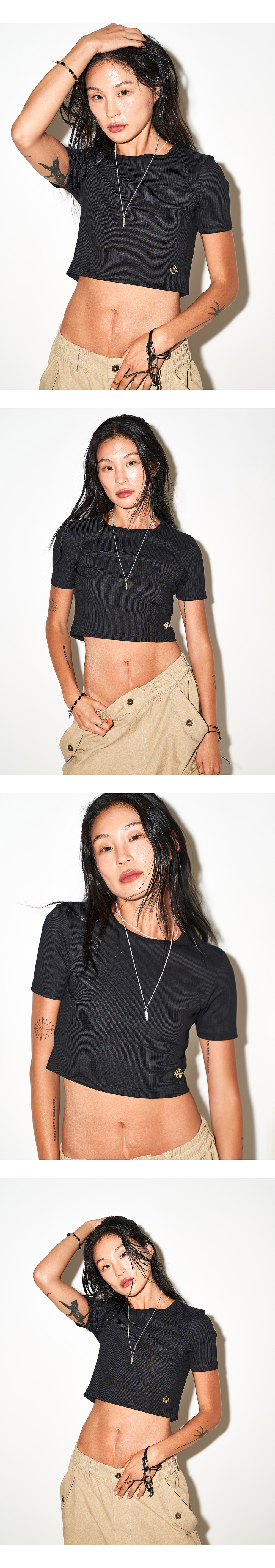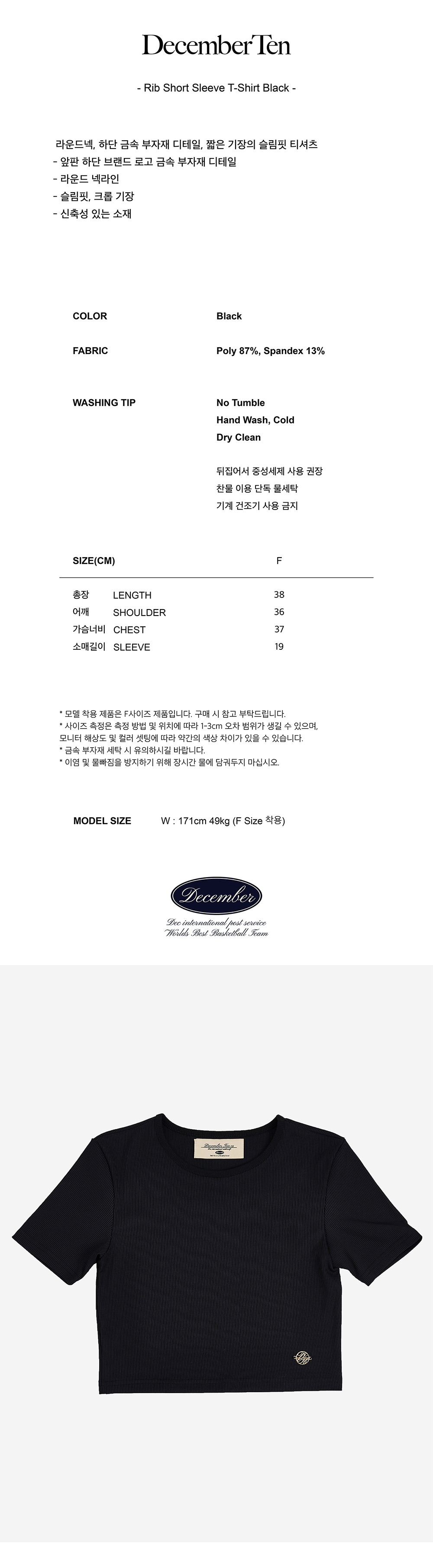 December Ten Rib Short Sleeve T-Shirt 립 숏슬리브 티셔츠 Color : White/Black Detail 라운드넥, 하단 금속 부자재 디테일, 짧은 기장의 슬림핏 티셔츠 - 앞판 하단 브랜드 로고 금속 부자재 디테일 - 라운드 넥라인 - 슬림핏, 크롭 기장 - 신축성 있는 소재 - Poly 87% / Span 13% Cleanning - 중성세제 기계세탁 가능 - 기계 건조기 사용 금지 - 손세탁 권장 Size Free Length : 38cm Shoulder: 36cm Chest : 37cm Sleeve : 19cm Model Size W: Height 171cm 49kg ( Free Size ) 제조자: 디셈버텐 제조국: 대한민국 제조년월: 25년 5월 품질보증기준: 본 제품은 공정거래위원회 고시 소비자 분쟁해결기준에 의거 보상받으실 수 있습니다. A/S: 02-743-7514