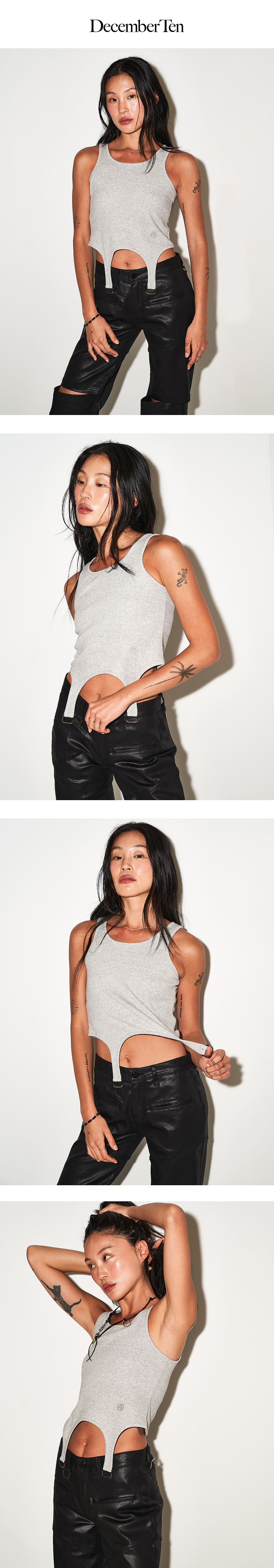 December Ten Suspender Rib Tank Top 서스펜더 립 탱크탑 Color : White/Black/Grey Detail 라운드넥과 뒷판 절개라인, 서스펜더 띠 디테일을 이용한 슬림핏 탱크탑 - 앞판 하단 브랜드 로고 자수 디테일 - 라운드 넥라인 - 뒷판 절개선 가이루빠 - 비치지 않는 약간 두꺼운 소재 - Cotton 66% / Poly 34% Cleanning - 중성세제 기계세탁 가능 - 기계 건조기 사용 금지 - 손세탁 권장 Size Free Length : 36cm Shoulder: 26cm Chest : 34cm Model Size W: Height 171cm 49kg ( Free Size ) 제조자: 디셈버텐 제조국: 대한민국 제조년월: 25년 5월 품질보증기준: 본 제품은 공정거래위원회 고시 소비자 분쟁해결기준에 의거 보상받으실 수 있습니다. A/S: 02-743-7514