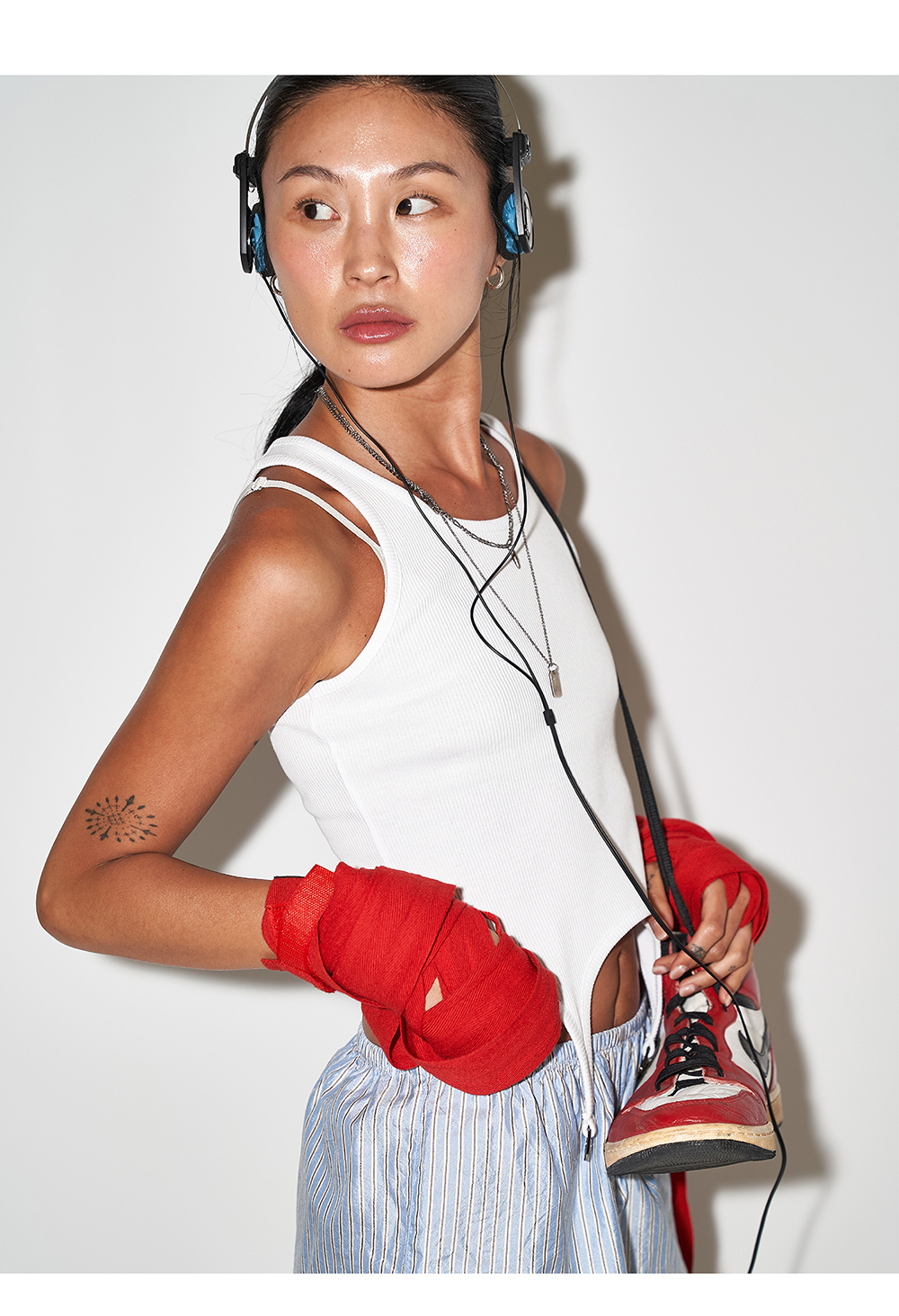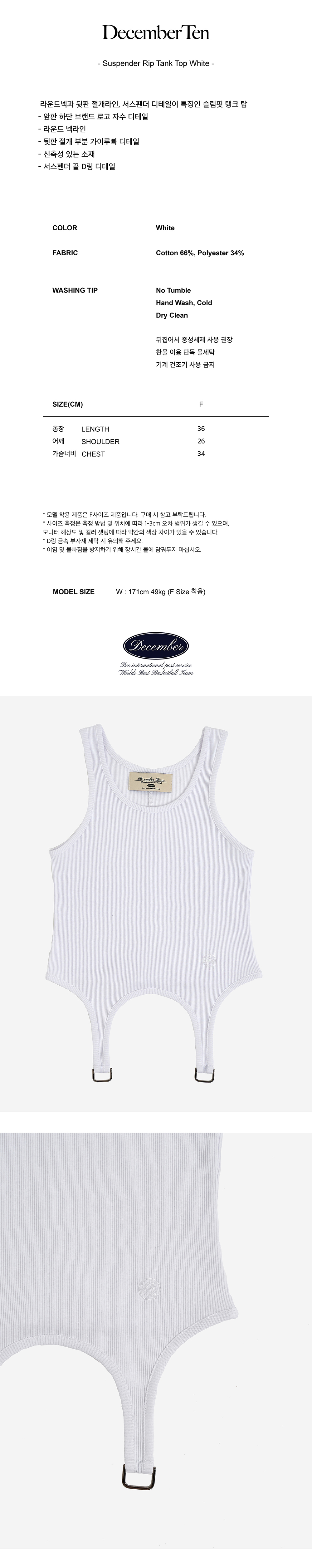 December Ten Suspender Rib Tank Top 서스펜더 립 탱크탑 Color : White/Black/Grey Detail 라운드넥과 뒷판 절개라인, 서스펜더 띠 디테일을 이용한 슬림핏 탱크탑 - 앞판 하단 브랜드 로고 자수 디테일 - 라운드 넥라인 - 뒷판 절개선 가이루빠 - 비치지 않는 약간 두꺼운 소재 - Cotton 66% / Poly 34% Cleanning - 중성세제 기계세탁 가능 - 기계 건조기 사용 금지 - 손세탁 권장 Size Free Length : 36cm Shoulder: 26cm Chest : 34cm Model Size W: Height 171cm 49kg ( Free Size ) 제조자: 디셈버텐 제조국: 대한민국 제조년월: 25년 5월 품질보증기준: 본 제품은 공정거래위원회 고시 소비자 분쟁해결기준에 의거 보상받으실 수 있습니다. A/S: 02-743-7514