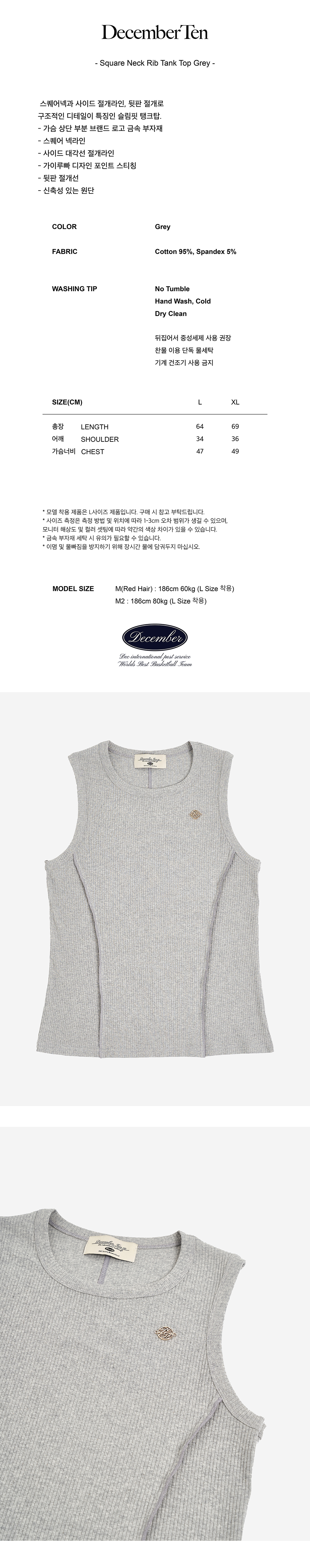 December Ten Square Neck Rib Tank Top 스퀘어넥 립 탱크탑 Color : White/Black/Grey Detail 스퀘어넥과 사이드 절개라인, 뒷판 절개로 구조적인 디테일을 이용한 슬림핏 탱크탑 - 가슴 상단 부분 브랜드 로고 금속 부자재 - 스퀘어 넥라인 - 사이드 대각선 절개라인, 가이루빠 - 뒷판 절개선 - 비치지 않는 약간 두꺼운 소재 - Cotton 95% / Span 5% Cleanning - 기계 건조기 사용 금지 - 찬물 손세탁 권장 Size L/XL Length : 64/69cm Shoulder: 34/36 cm Chest : 47/49 cm Model Size M(Red Hair): Height 186cm 60kg ( L Size ) M: Height 186cm 80kg ( L Size ) 제조자: 디셈버텐 제조국: 대한민국 제조년월: 25년 5월 품질보증기준: 본 제품은 공정거래위원회 고시 소비자 분쟁해결기준에 의거 보상받으실 수 있습니다. A/S: 02-743-7514