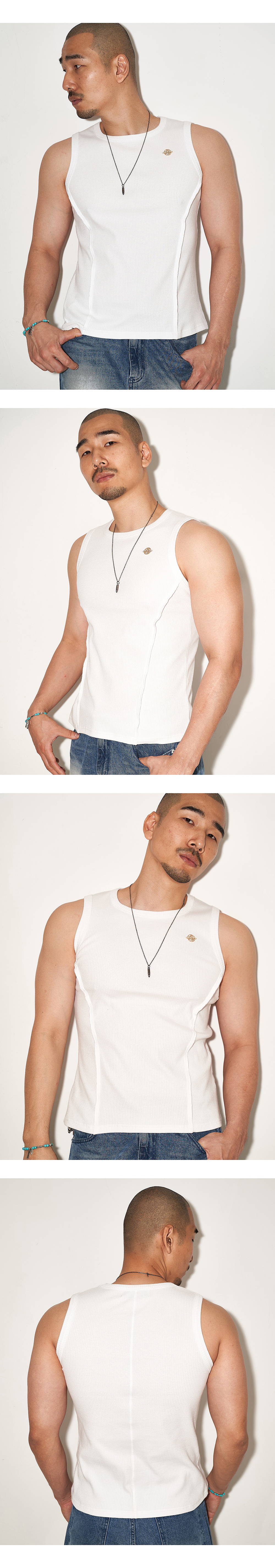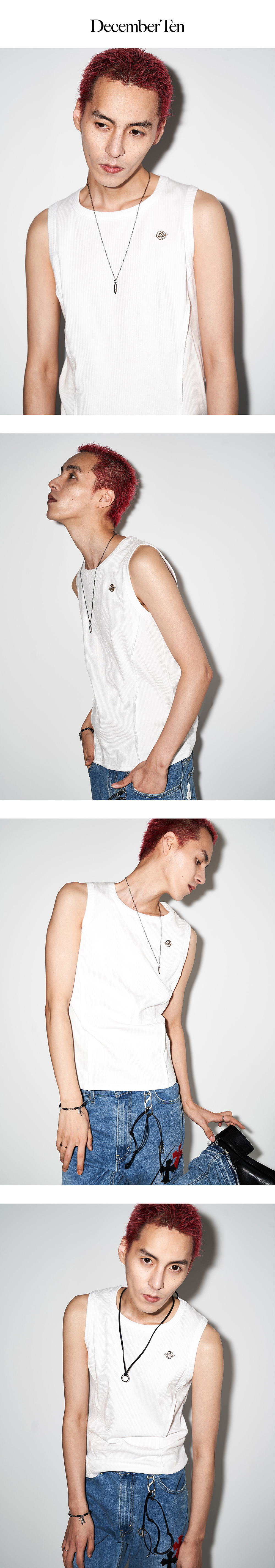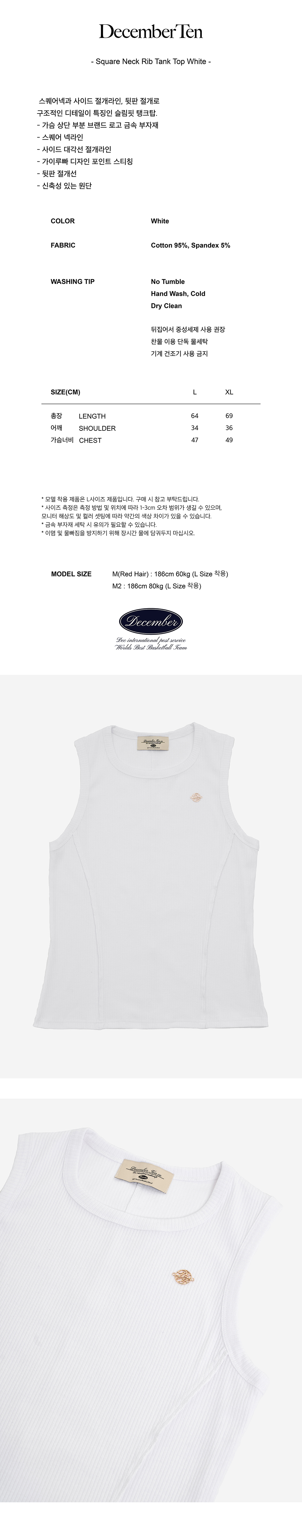December Ten Square Neck Rib Tank Top 스퀘어넥 립 탱크탑 Color : White/Black/Grey Detail 스퀘어넥과 사이드 절개라인, 뒷판 절개로 구조적인 디테일을 이용한 슬림핏 탱크탑 - 가슴 상단 부분 브랜드 로고 금속 부자재 - 스퀘어 넥라인 - 사이드 대각선 절개라인, 가이루빠 - 뒷판 절개선 - 비치지 않는 약간 두꺼운 소재 - Cotton 95% / Span 5% Cleanning - 기계 건조기 사용 금지 - 찬물 손세탁 권장 Size L/XL Length : 64/69cm Shoulder: 34/36 cm Chest : 47/49 cm Model Size M(Red Hair): Height 186cm 60kg ( L Size ) M: Height 186cm 80kg ( L Size ) 제조자: 디셈버텐 제조국: 대한민국 제조년월: 25년 5월 품질보증기준: 본 제품은 공정거래위원회 고시 소비자 분쟁해결기준에 의거 보상받으실 수 있습니다. A/S: 02-743-7514