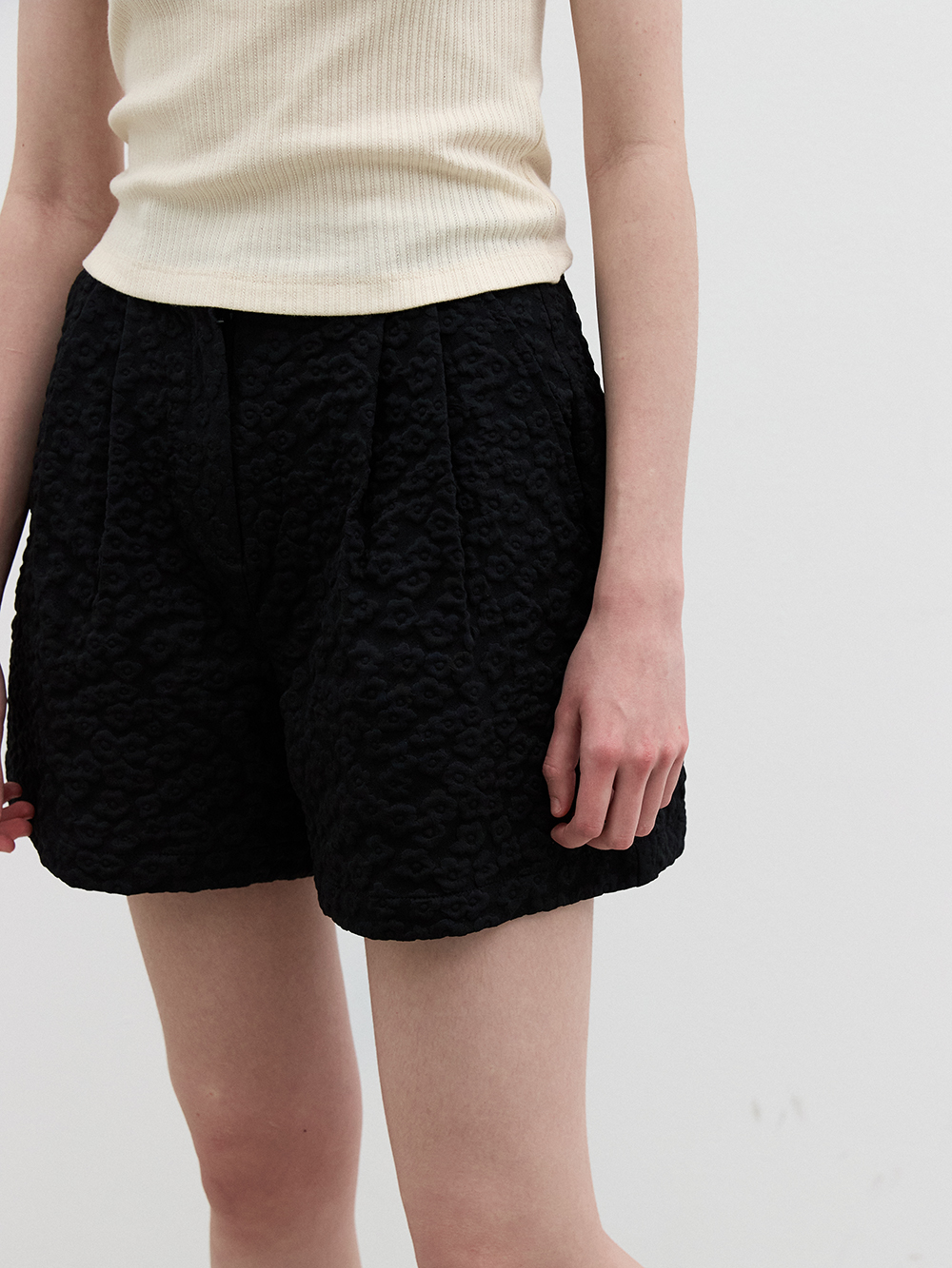 2025 SUMMER COLLECTION - 플라워 패턴 짜임의 자카드 원단 - 워싱가공된 부드러운 터치감의 쇼츠 - YKK사의 바지지퍼 - 전면의 투턱디테일의 자연스러운 볼륨감 - 제품 컬러는 상세페이지의 누끼이미지와 제일 흡사합니다. - Made in korea +COLOR Black, White +CARE Dry cleaning , 단독세탁 권장