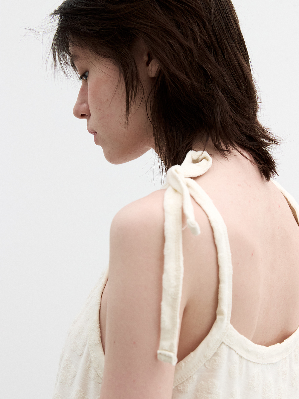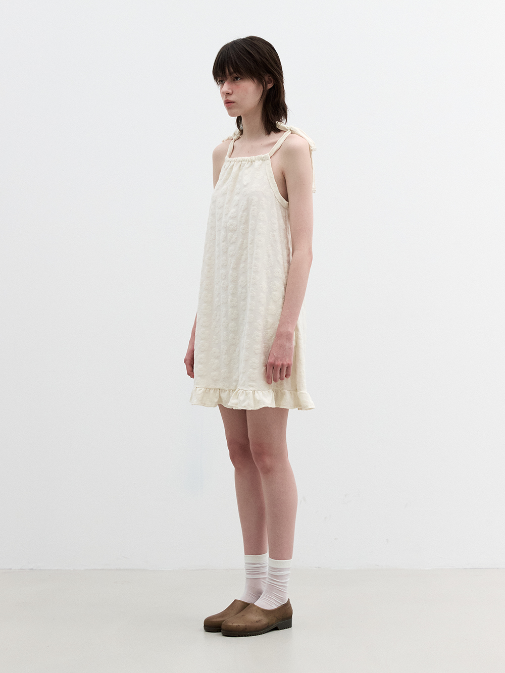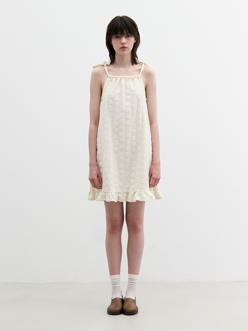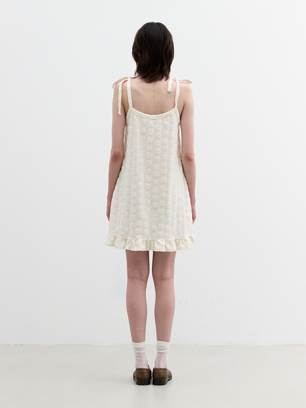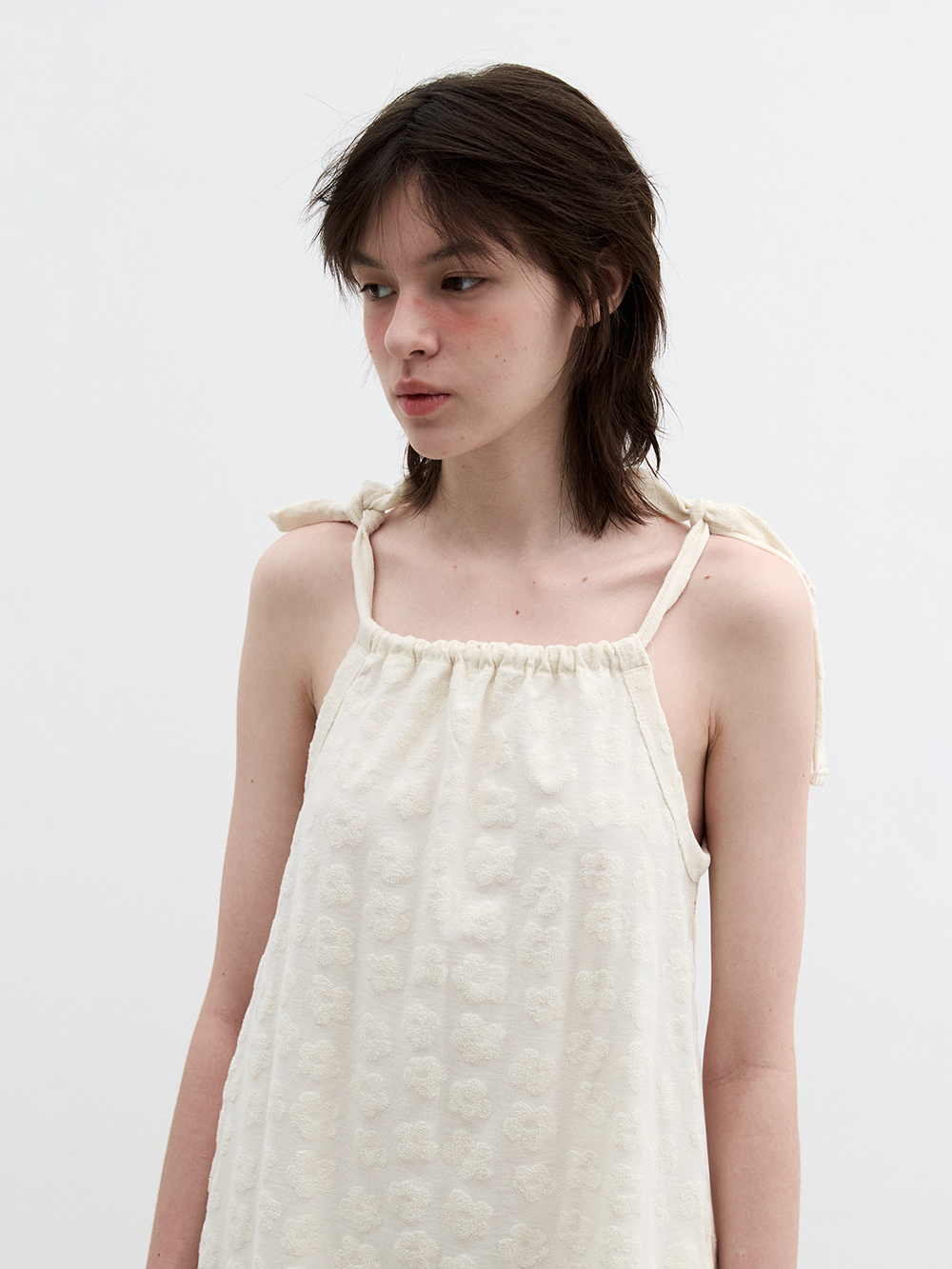2025 SUMMER COLLECTION - 플라워 패턴 짜임의 자카드 원단 - 독특한 테리원단의 A라인 실루엣의 슬리브리스 드레스 - 밑단의 프릴 디테일 - 어깨를 묶는 형식의 다양한 스타일링 - 단독착용 및 레이어드로 다양한 스타일링 - 제품 컬러는 상세페이지의 누끼이미지와 제일 흡사합니다. - Made in korea +COLOR Blue/Beige , Cream +CARE Dry cleaning , 단독세탁 권장