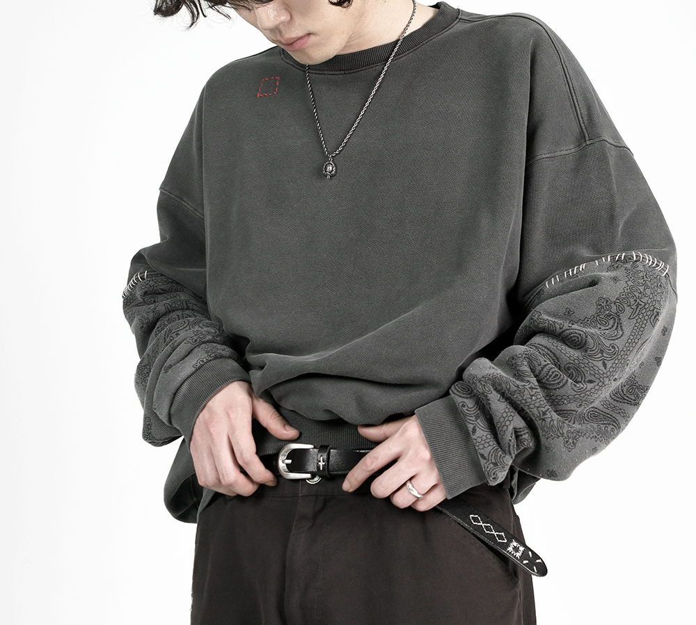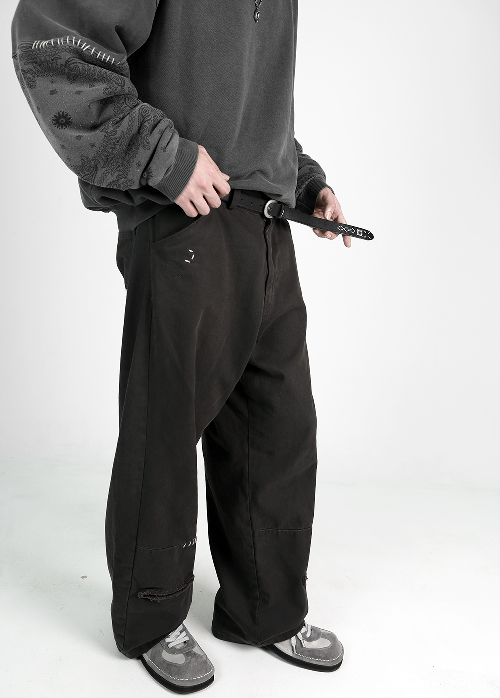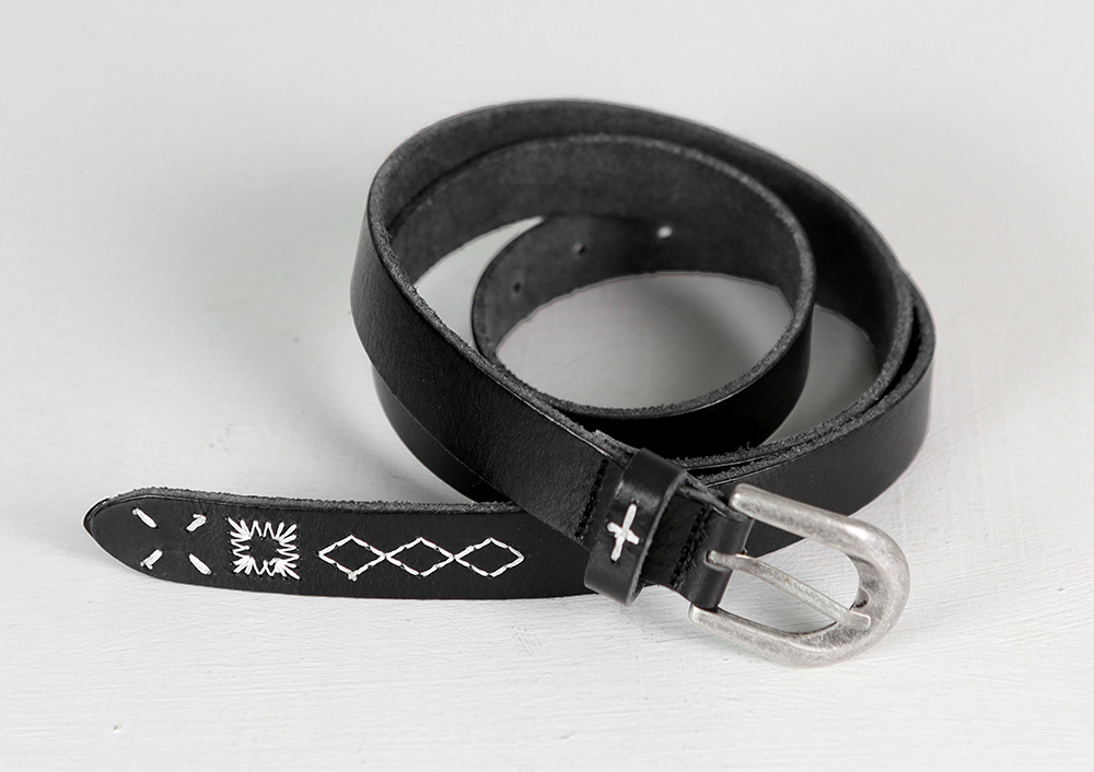 [올드레거시_블랙] 워싱처리 된 천연 소가죽을 가죽 본연 그대로 재단하여 핸드스티치로 마무리했습니다. 주름진 가죽의 질감 위로 다양한 모양들이 수놓아져 오래된 유물 같은 느낌을 자아냅니다. *디테일 벨트 고리/끝단 핸드스티치 빈티지 버클