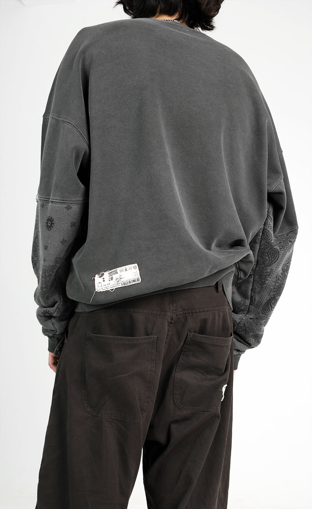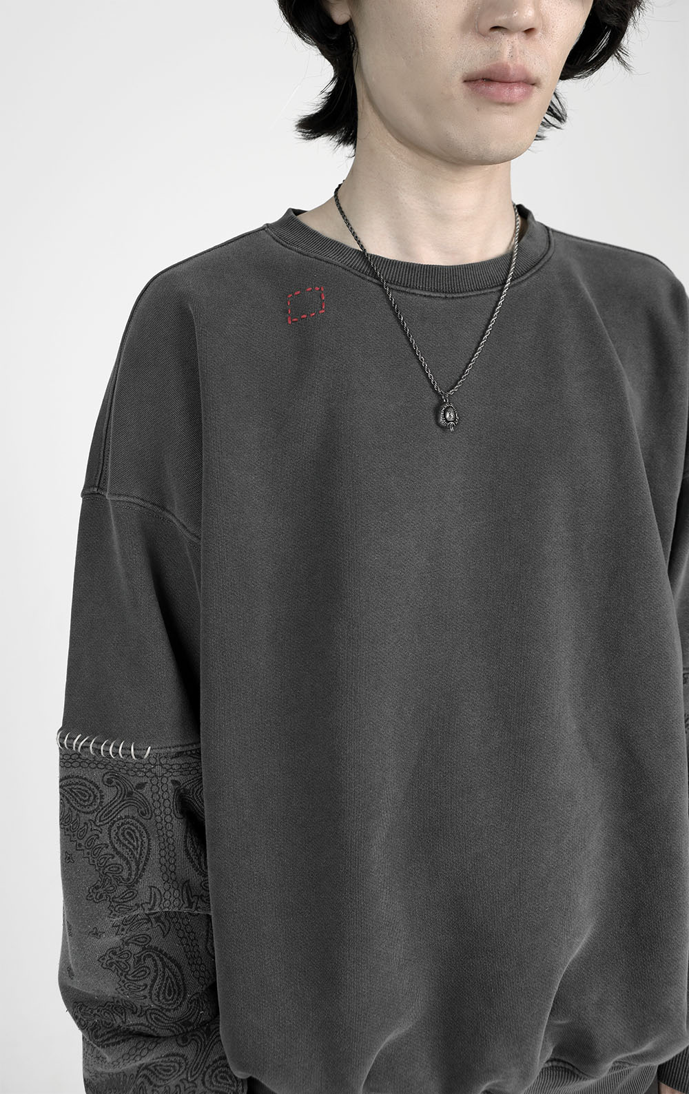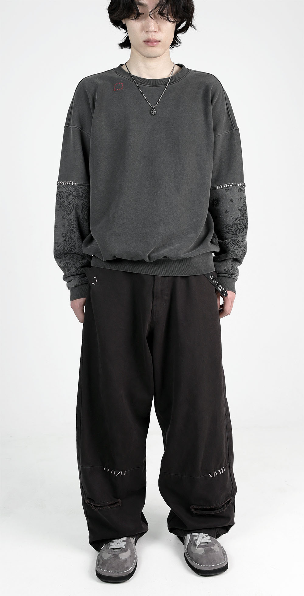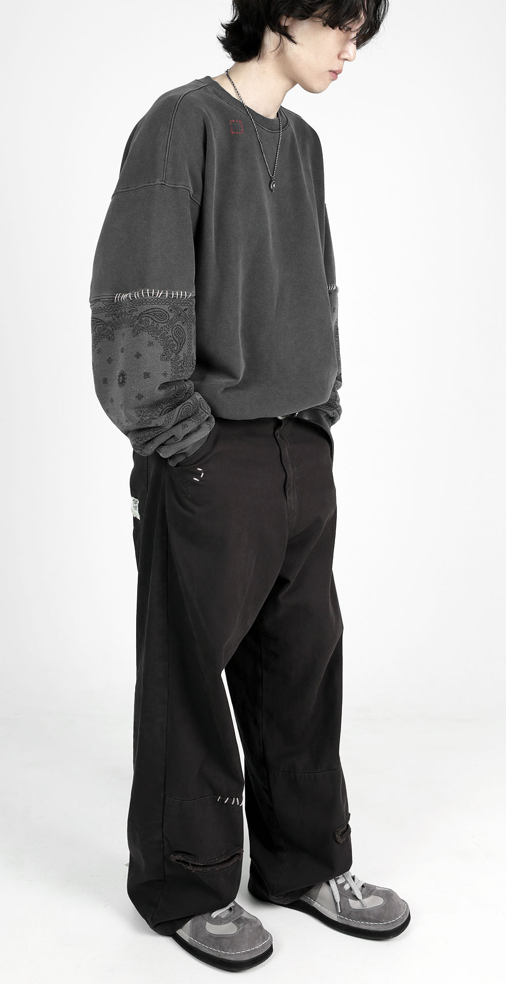낡은 공장에서 일하는 중인 작업자의 팔에 끼워진 팔토시에서 영감을 받아 제작했습니다. 팔 부분에 반다나 패턴의 원단을 덧대고 핸드스티치를 더하여 시간의 흔적을 새겼습니다. *디테일 일부 반다나 원단 패치워크 패치 연결부/포인트 사시코 핸드스티치 후면 하단 빈티지 케어라벨 피그먼트 다잉/워싱 처리 caution 반다나 원단은 빈티지 가공하여 자연스러운 보풀이 발생합니다. 스크래치/미세한 오염/봉제부 색뭉침은 피그먼트 가공 특성이며, 후가공 특성상 염료의 고착 정도에 따라 구현되는 색상의 농도차이가 있을 수 있습니다.