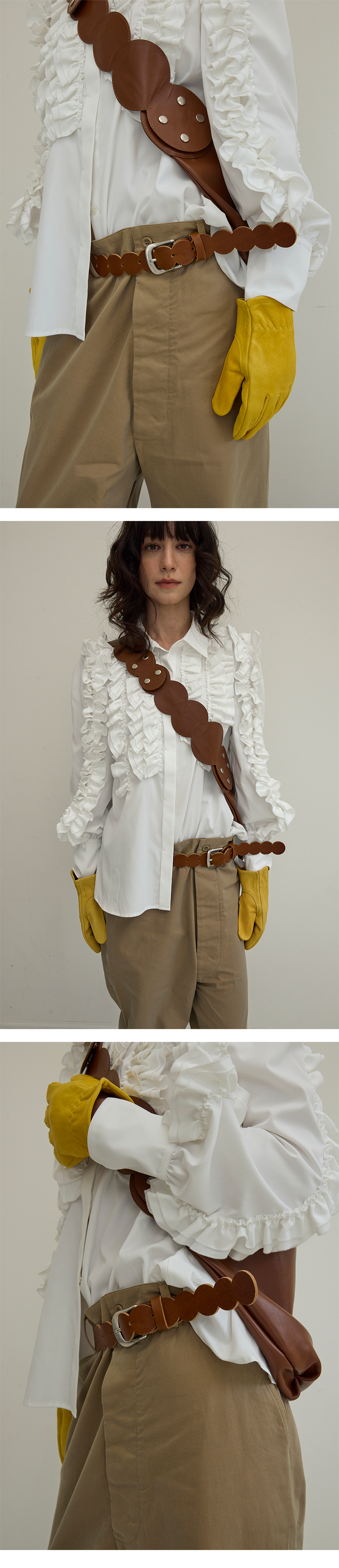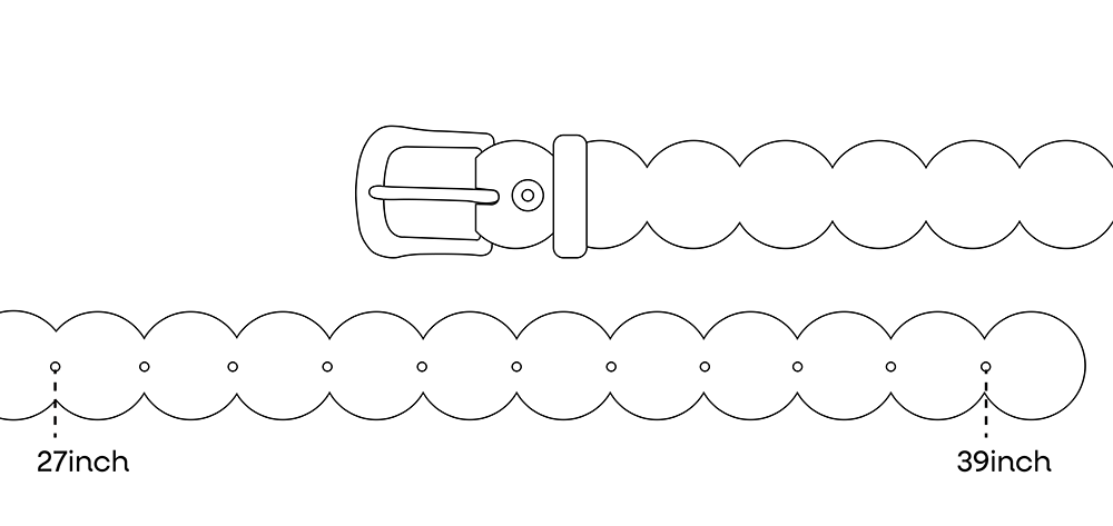 DETAILS 밤볼레의 시그니처 곡선 패턴을 그대로 담아낸 레더 벨트입니다. 매끈한 원형의 반복이 유려한 리듬을 만들어내며, 착용하는 순간 심플한 룩에도 확실한 포인트가 되어줍니다. 시간이 지날수록 통가죽과 황동 고유의 에이징이 더해지며, 사용자의 손길을 따라 더욱 멋스럽게 변화합니다. 팬츠는 물론, 드레스나 자켓 위에 살짝 둘러 감각적인 레이어링을 완성해보세요. 밤볼레의 미감과 소재의 조화가 잘 어우러진 아이템입니다. MATERIAL Cow leather 100% -가죽은 이탈리아 발피에르(Conceria Walpier)사의 부테로 복스(Buttero Box) 레더를 사용하였습니다. Brass -버클은 황동(brass) 소재에 빈티지 니켈 도금으로 제작되어 시간이 지남에 따라 자연스럽게 황동 고유의 컬러가 올라옵니다. SIZE length 100 / width 3.3cm Free size (fits waist 27 - 39 inch)