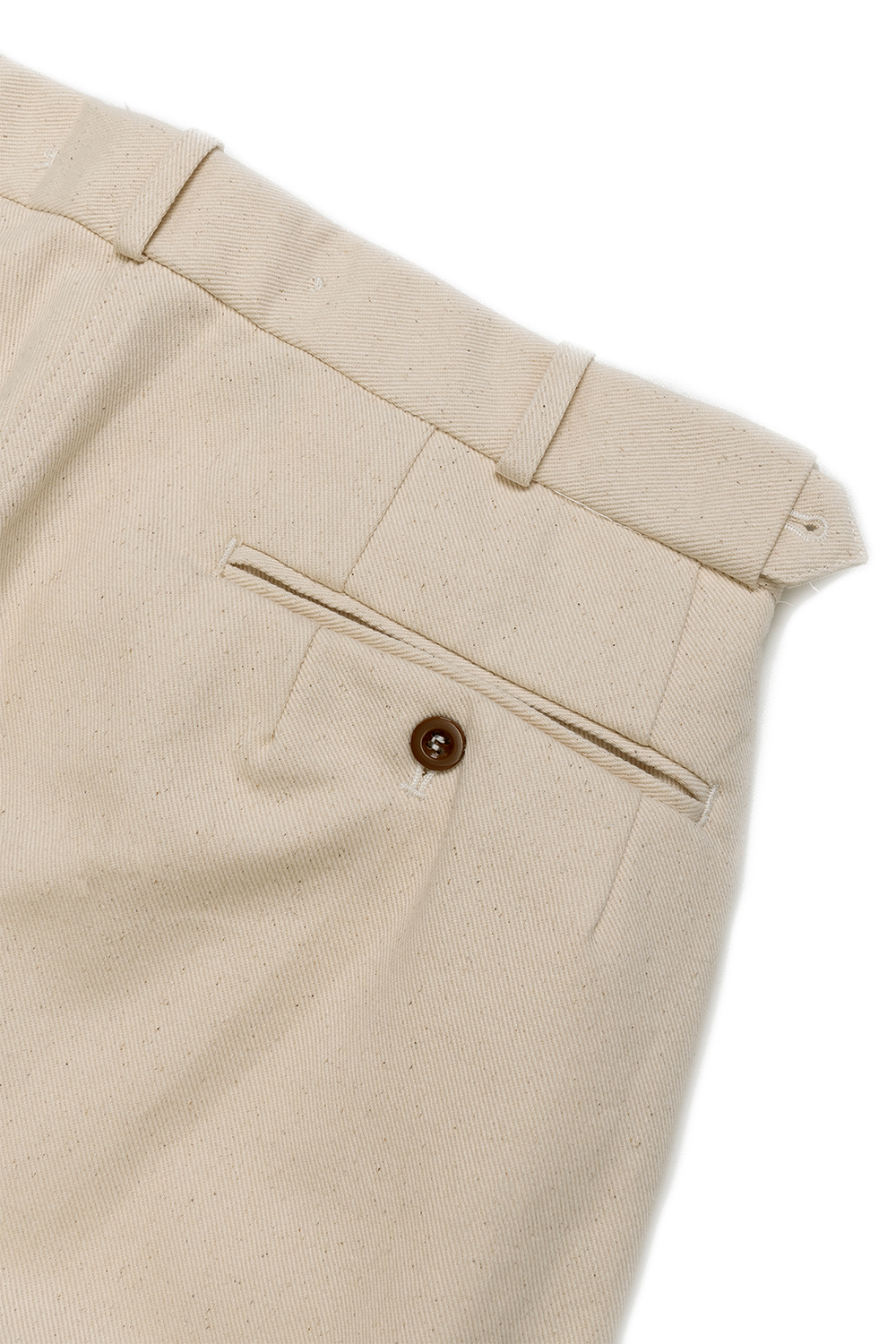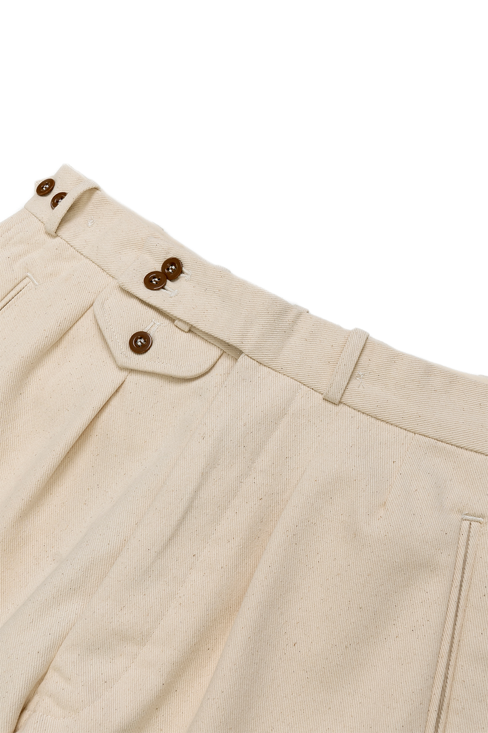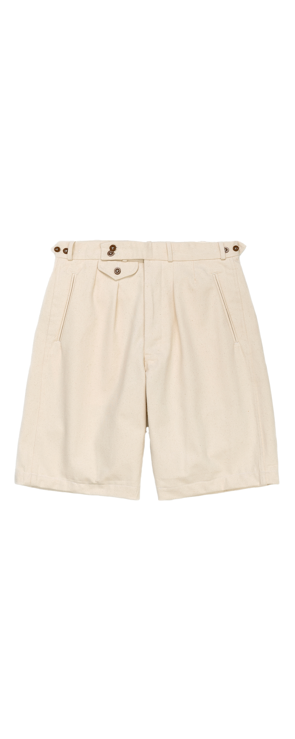 YMCL KY German Type Navy Tropical Short Pants - Natural 1960년대 채용된 열대 지역용 팬츠를 복각 제품의 쇼츠 버전입니다. 두 개의 벨트 버튼과 워치포켓,벨트 루프를 겸한 서스펜더 스트랩 등 1940년대 독일 해군의 트로피컬 팬츠의 영향을 받았습니다. 투 턱으로 와이드한 실루엣의 팬츠입니다. 양 사이드의 고무로 되어있는 스트랩으로 허리 사이즈를 조절할 수 있습니다. * Cotton * 빛에 의한 제품의 색감 차이가 존재 할 수 있습니다. * Made in China (cm) 78 :허리 38.5 밑위31.5 허벅지36 밑단22.5 총장 55 83 :허리 40 밑위 31.5 허벅지 37 밑단 23 총장 55 85 :허리 43 밑위 33 허벅지 37.5 밑단 23.5 총장 56.5 92 :허리 45 밑위 33 허벅지 38.5 밑단 24 총장 56.5 * 측정 방법에 따라 오차가 발생할 수 있습니다.