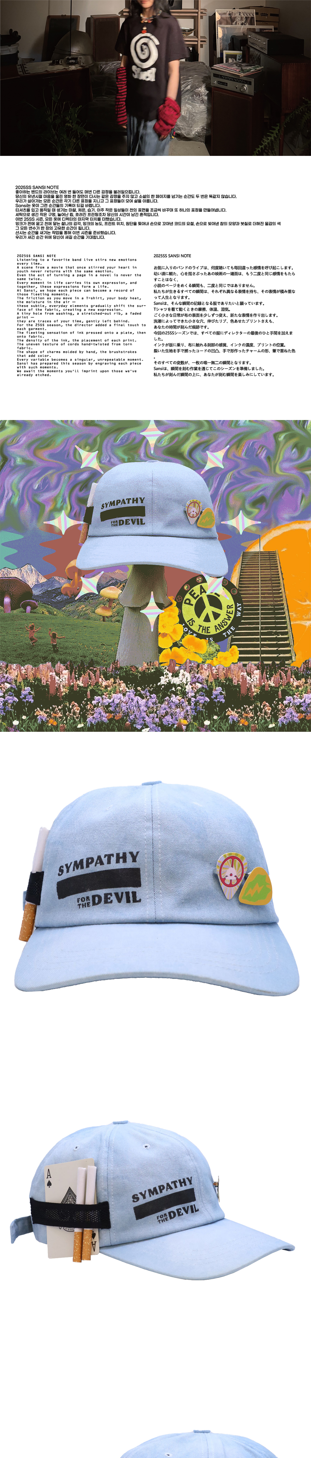 - 천연 인디고 염색으로 컬러 표현 - 6 panel 캡 - 'Sympathy for the Devil' 프린트 - Sansi Shell & Peace 로고 피크 - 25th Infantry Division insignia 피크 - Helmet camouflage band 모티브 사이드 밴드 -워싱, 다잉, 프린팅은 모두 수작업으로 진행되어 개체별로 차이가 있을 수 있습니다.