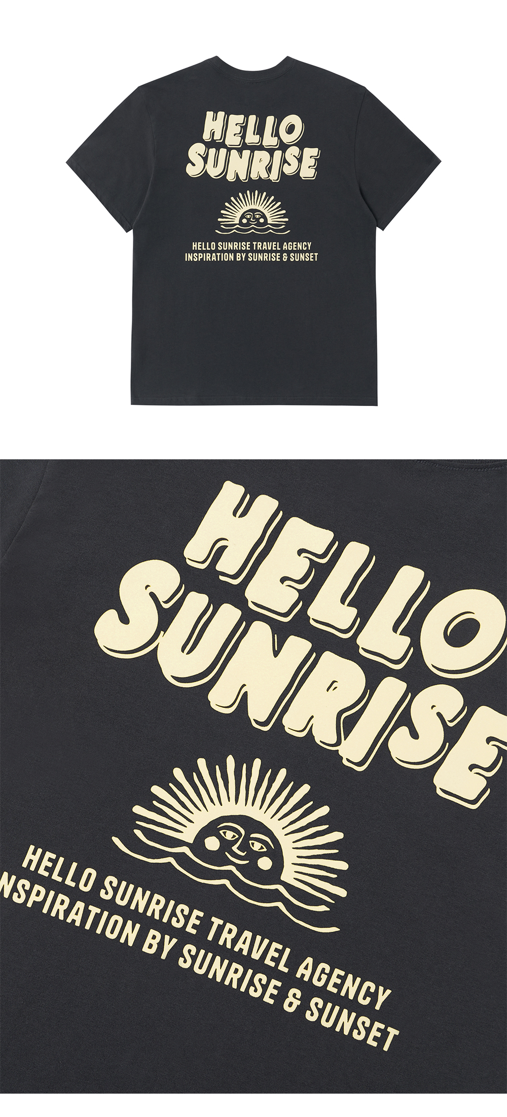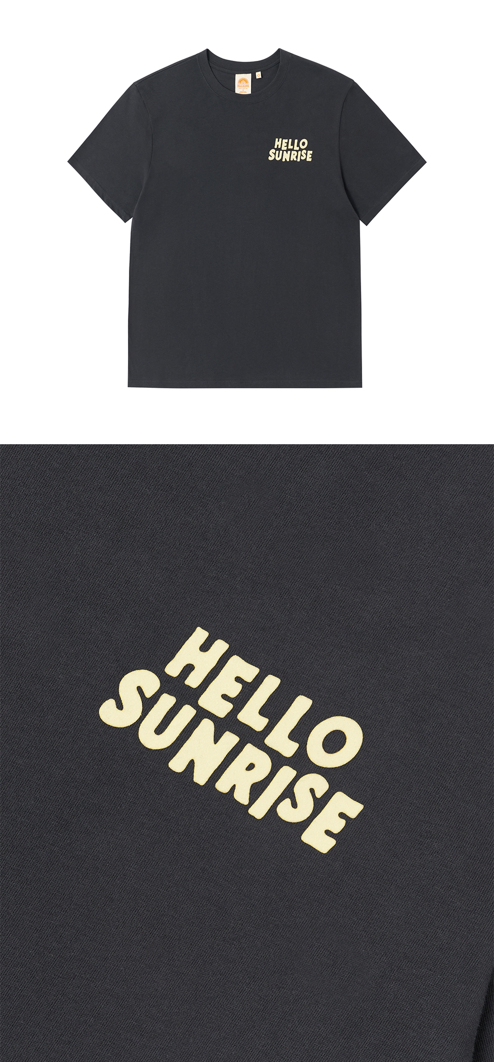 Hello Sunrise 스탠다드 핏의 남녀 공용의 반팔 티셔츠입니다. - 전면 헬로선라이즈 Volume Typo 후로피 그래픽 - 후면 헬로선라이즈 Volume Logo 후로피 그래픽 - 이전보다 여유로워진 사이즈와 착용감 * 측정 기준에 따라 1-2cm의 차이가 있을 수 있습니다. * Cotton 100% Made in Korea