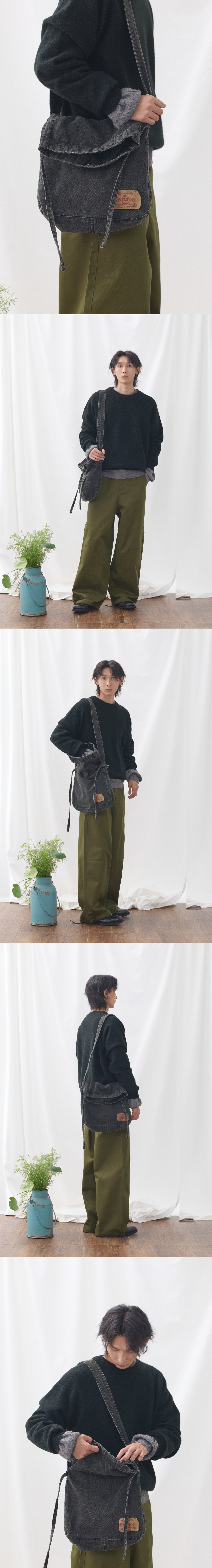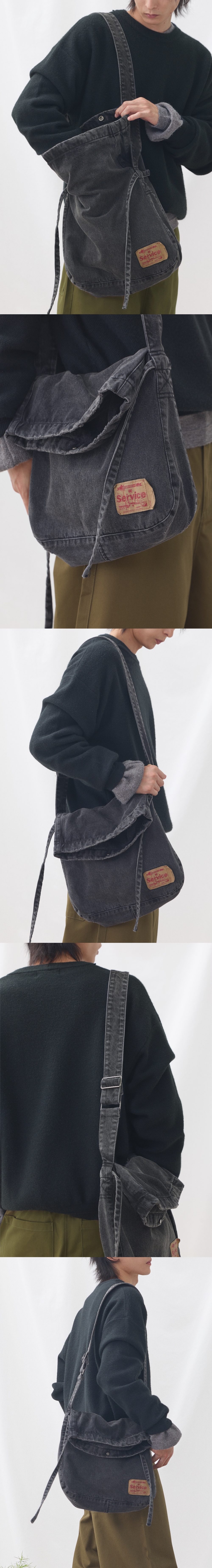 스톤 워싱 및 구제 워싱 디테일로 빈티지한 무드가 연출된 블랙컬러 데님 크로스백 폴디드 스타일 가방에 제원단 스트링을 더하여 기호에 맞는 스타일 및 실루엣 연출 가능 가방 입구 및 내부 포켓에 흑니켈 컬러 금속 스냅을 사용하여 실용성과 내구성을 갖춤 가방 내부 포켓을 활용하여 수납 및 편의성을 연출 브랜드 무드에 맞는 종이 택션지를 같이 워싱하여 빈티지 감성을 연출 Shell : Cotton 100% SIZE INFO Free : 높이 47 , 폭 36 (cm)